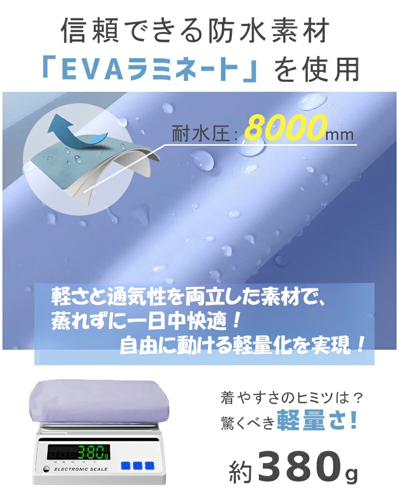 環境に配慮した新型の防水素材を使用しており、無臭で着心地も良好です。通気性に優れており、真夏でも快適にお使いいただけます。丈夫でありながら柔らかく、破れにくいので、長期間ご利用いただけます。防水性が高く、さらに高抗汚性を備えているので、大雨の日でも安心してご使用いただけます。