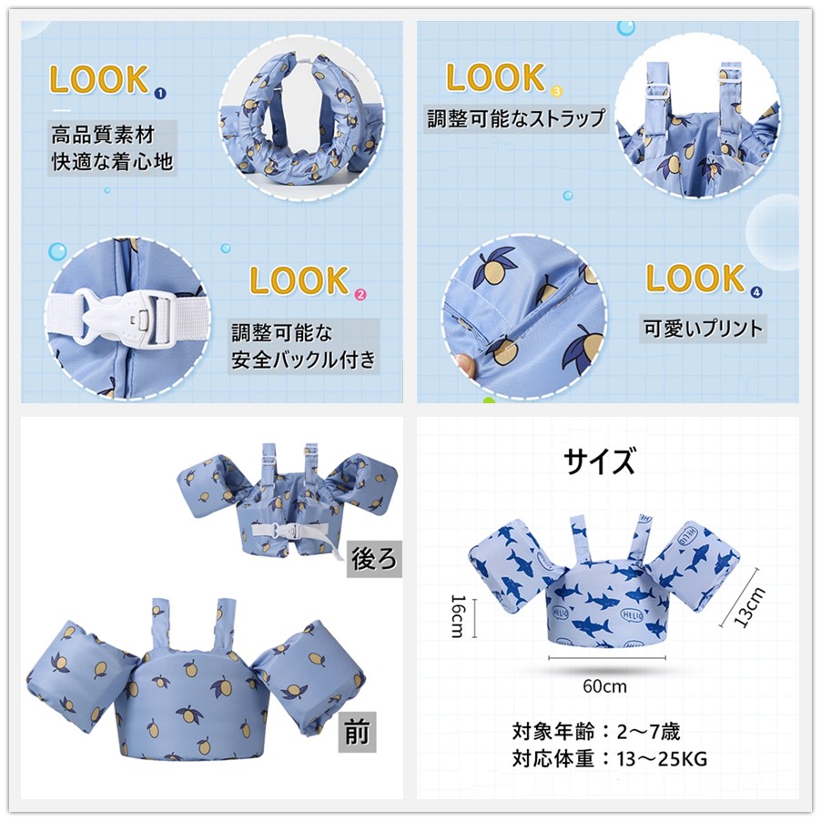 対象年齢は2歳から7歳、体重は10kgから25kg。強い浮力で水泳の練習に最適な補助具です。男女兼用で、フリーサイズのため幅広いお子様に対応します。