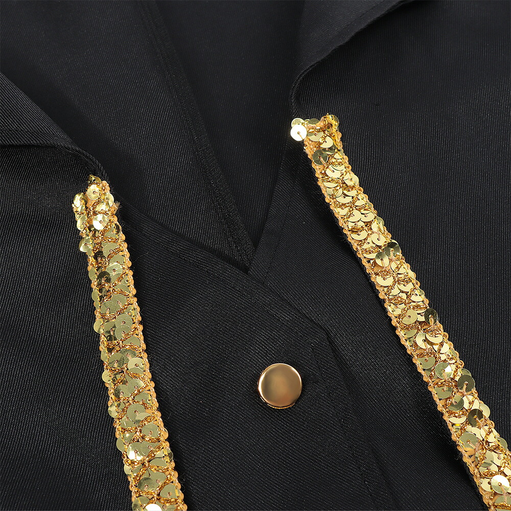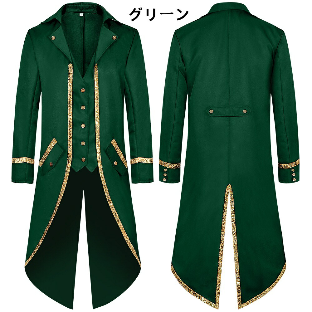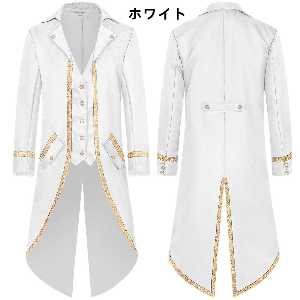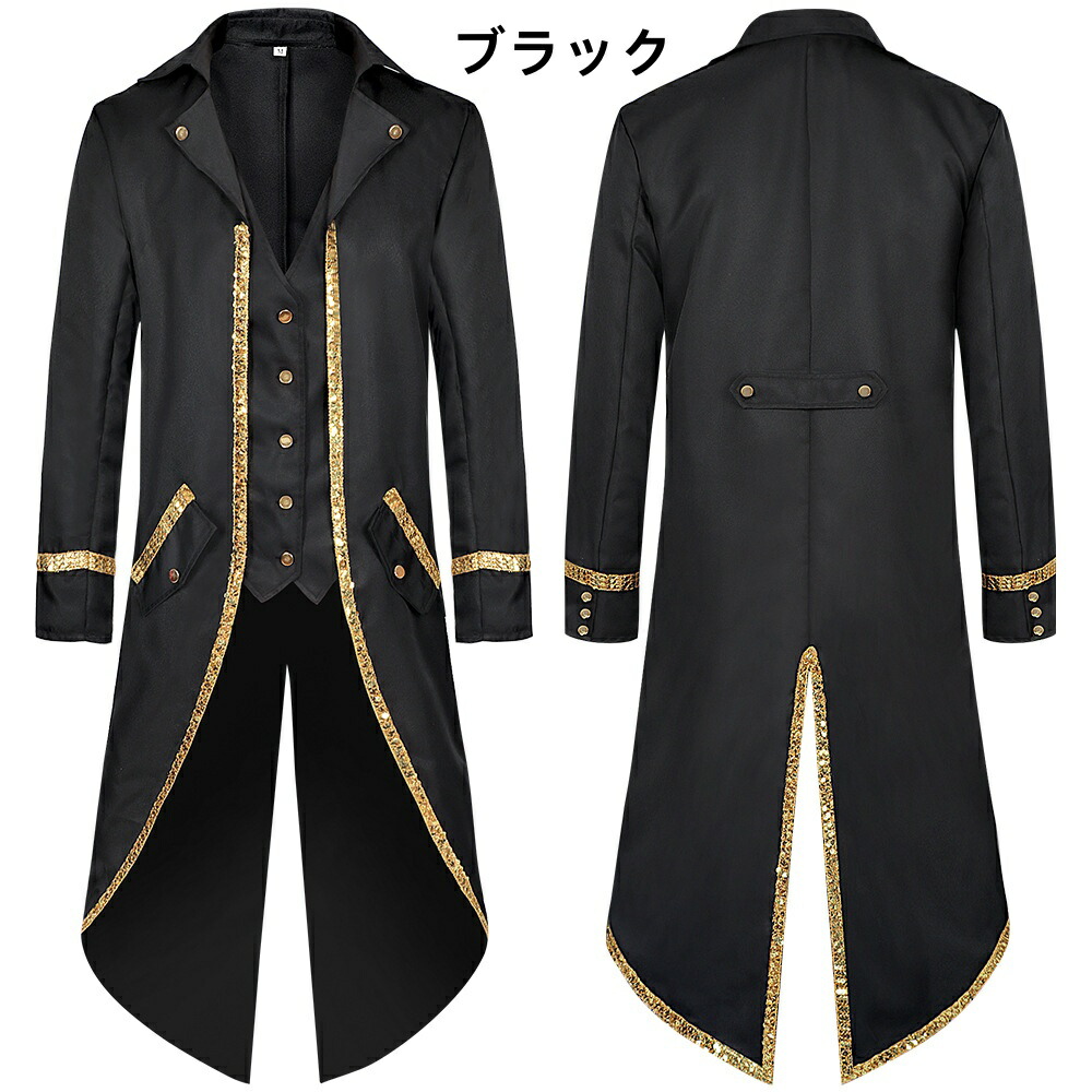 メンズコスプレジャケット 舞台衣装 ロング ゴールドスパンコール裾 燕尾服 レトロスチームパンク 無地 欧風 ヨーロッパ風 王子様 貴族 マジシャン ステージ衣装 パーティー 舞台劇 学園 ハロウィン