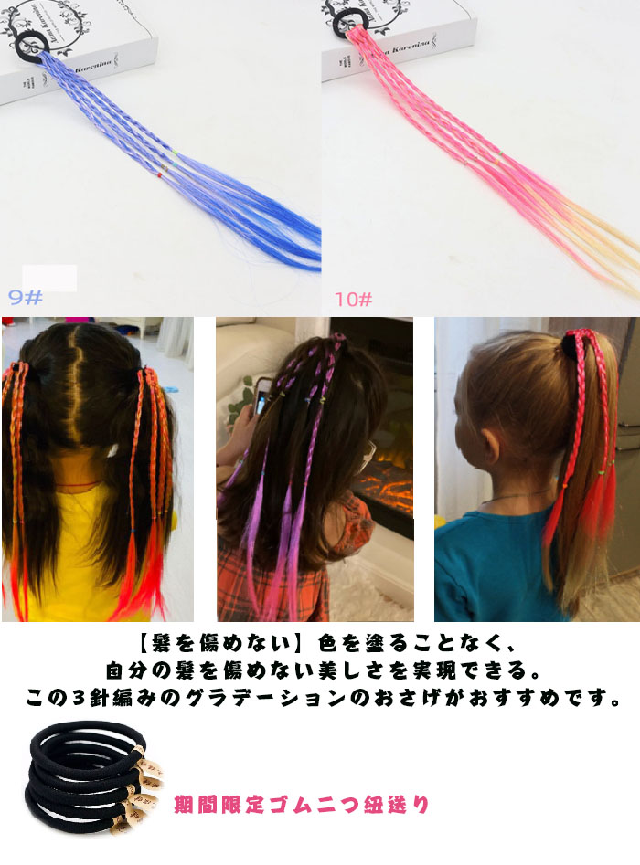 * 髪を傷めない:色を塗ることなく、自分の髪を傷めない美しさを実現できる。この3針編みのグラデーションのおさげがおすすめです。