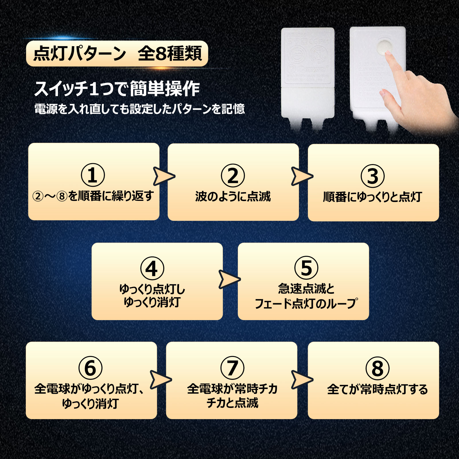 オススメポイント 高輝度LED球 弊社で取り扱っておりますイルミは格段に明るく美しい発光が特徴のLEDで、高輝度省電力長寿命です。 広拡散LEDを採用して一粒一粒が明るくてどこから見ても明るく見える広角拡散パッケージです。 光線が柔らかく鮮やかに光って、幻の感じを作成できます。 長寿命省エネ 消費電力は従来のミニライト等と比べると、約1/5~1/10で小さく電球の寿命も長いので、とっても経済的です。 また低電圧のため消費電力が低くランニングコストを抑えたご利用が可能です。 PSE認証済 日本の電気用品安全法(PSE)の技術基準に適合した安全性の高い商品です。 8点灯パターン防水加工 コントローラーを使い点灯パターンを設定できます。 賑やかなシーンもロマンティックなシーンもお好みに合わせて演出できます。 お好みの点灯パターンを設定すれば美しいイルミネーションが楽しめます。屋外使用でも安心! LED部分が防水加工で、コントローラー部分が防滴加工です。室内屋外兼用!(防水PP袋付属) 点滅パターン: 1.Combination:2から8までを順番に繰り返す 2.In Waves:波のように点滅 3.Sequential:順番にゆっくり点灯 4.Slo-glo:ゆっくり点灯しゆっくり消える 5.Chasing Flash:激しく点滅 6.Slow Fade:全電球ゆっくり点灯ゆっくり消灯 7.Twinkle Flash:全電球が一度にまたたく 8.Steady on:全てが常時点灯する 適用場所 クリスマスシーズンには勿論、年末年始やパーティ(ハロウィンやクリスマスなど)、 お祭り、 バランタインなどお祝いイベント等あらゆる場面で大活躍間違いなし! ご家庭やお店、広場やパーティ会場を綺麗に彩ります。 省エネと発光色の多様化により、今や老若男女問わず大人気中のLEDイルミネーションをどうぞお楽しみください。 クリスマスツリーのデコレーションに最適です!