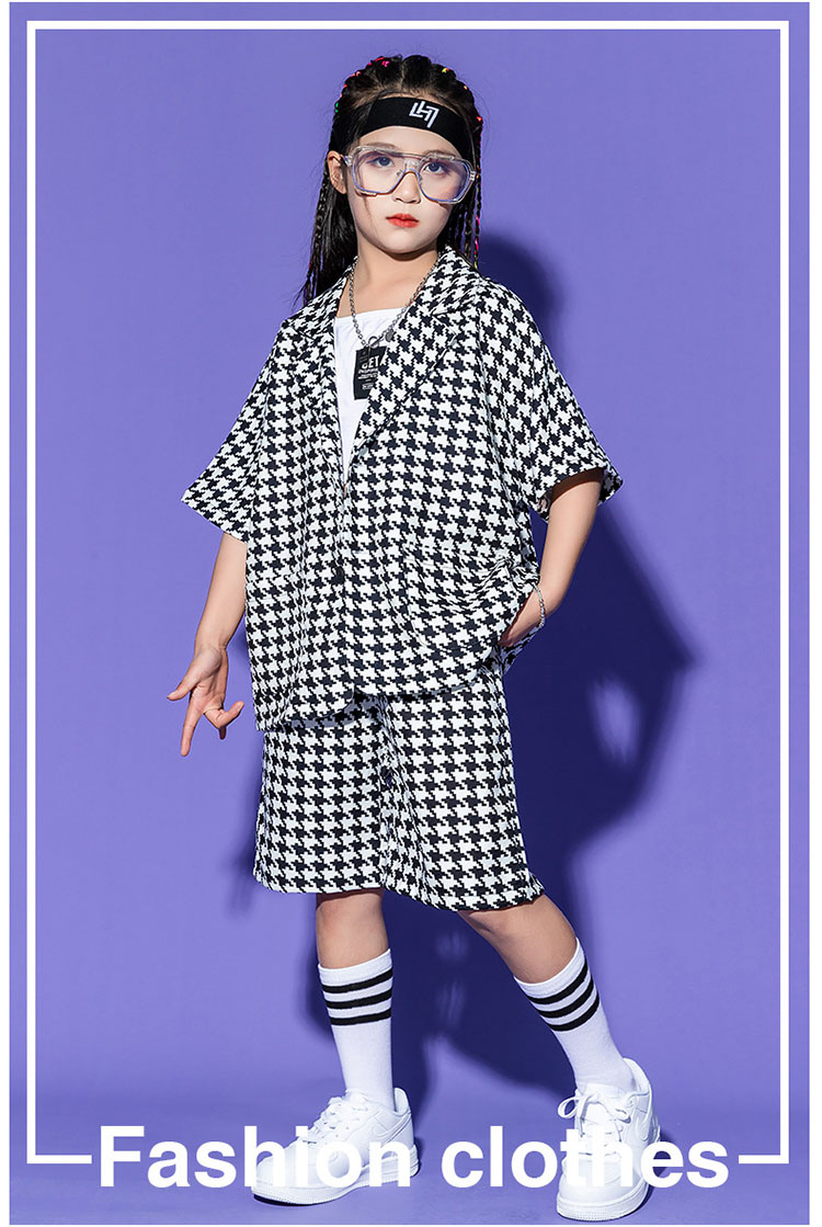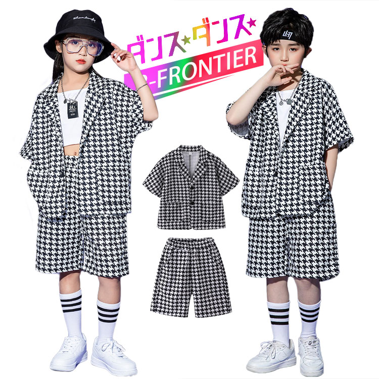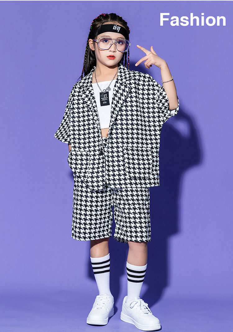 千鳥柄 ダンススーツ キッズダンス衣装 セットアップ 半袖 ジャケット ハーフパンツ 白黒 コート ショートパンツ 韓国 k-pop 衣装 ヒップホップ ジャズダンス 演出服 応援団 練習 チアダンス