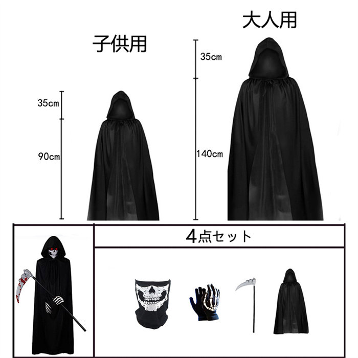 死神 4点セット コスプレ マント コスチューム 子供 大人 手袋 死神コス マスク 4点セット 鎌 ハロウィン 仮装 小道具 お化け屋敷