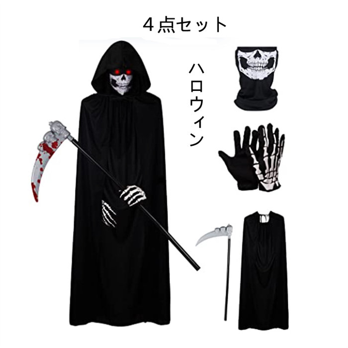 死神 4点セット コスプレ マント コスチューム 子供 大人 手袋 死神コス マスク 4点セット 鎌 ハロウィン 仮装 小道具 お化け屋敷 かま お面 ホラー 演出服舞台 骸骨