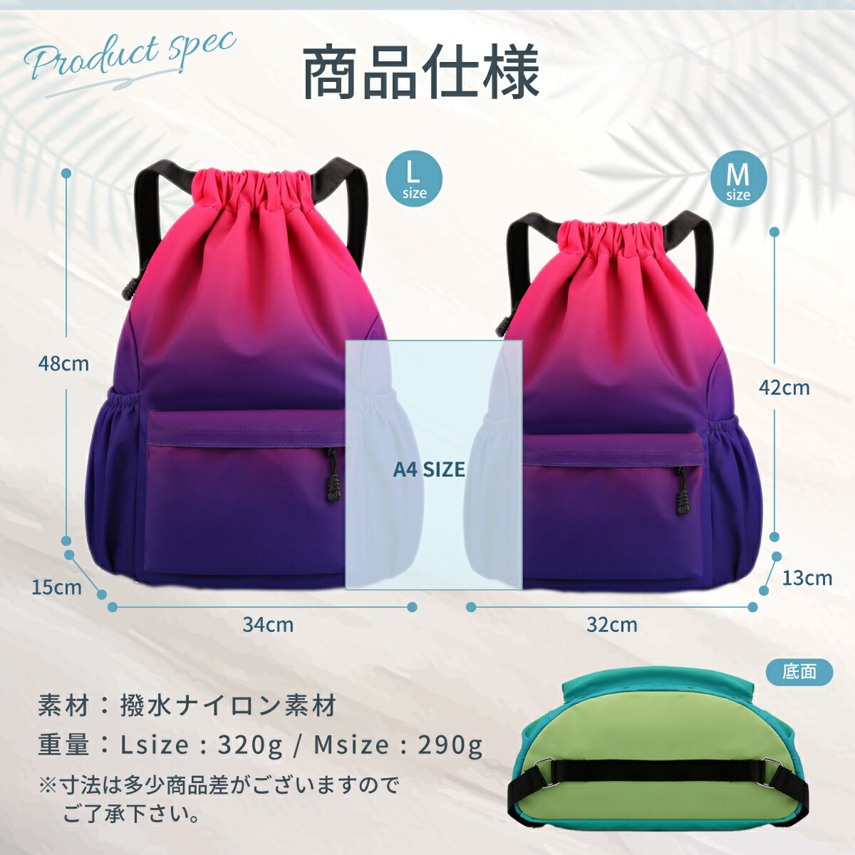このナップサックは、スポーツやジム、プール、部活などに最適な多機能バッグです。大容量で軽量、撥水加工が施されており、急な雨にも対応。プールバッグやランドリーバッグとしても使える便利なアイテムです。体操着や習い事の道具もスッキリ収納でき、男女兼用で、子供から大人まで幅広い年齢層に対応。おしゃれでかわいいデザインは、普段使いにもぴったり。防汚加工が施されているので、汚れが気になるシーンでも安心です。丈夫で長持ちし、通学や旅行にも活躍します。