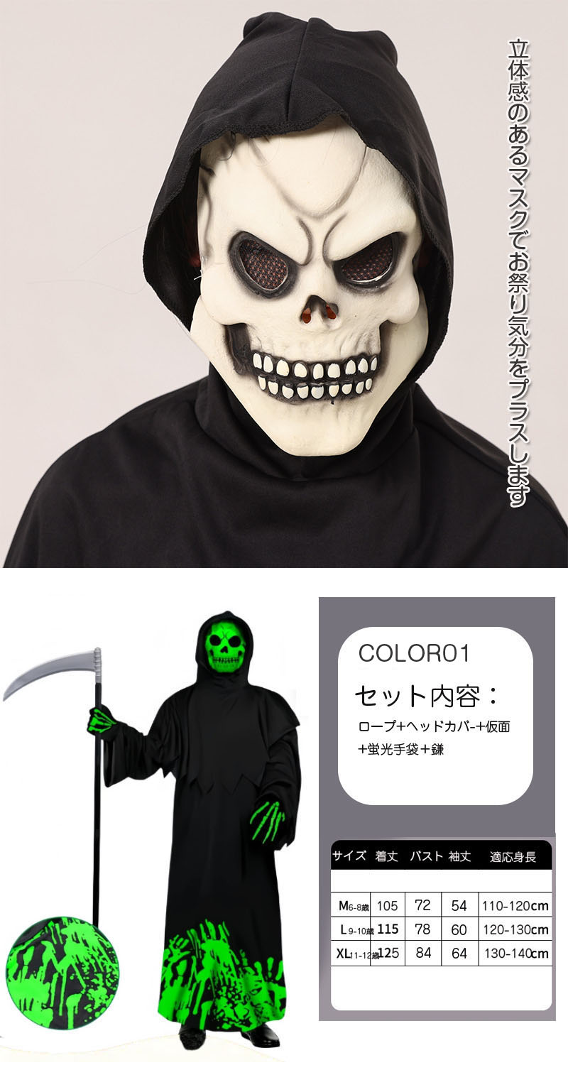 死神 ハロウィン 衣装 子供 3点セッ ホビー 48%Off COLOR01(6点セット)HOT COLOR02(ローブ単品) S(身長100-110cm) M(身長110-120cm) L(身長120-130cm) XL(身長130-140cm)
