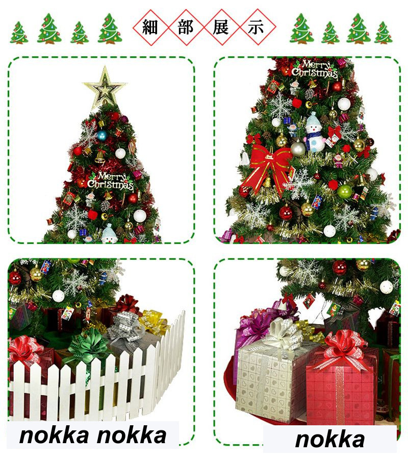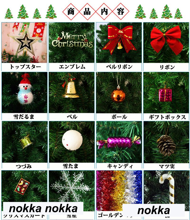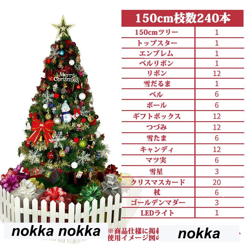 セット内容:150cmクリスマスツリー*1、トップスター*1、エンブレム*1、ベルリボン*1リボン*12、雪だるま*1、ベル*6、ボール*6、ギフトボックス*12、つづみ*12、雪たま*6、キャンディ*12、マツ実*6、雪星*3、クリスマスカード*20、杖*6、ゴールデンマダー*3、4mLEDライト*1。
