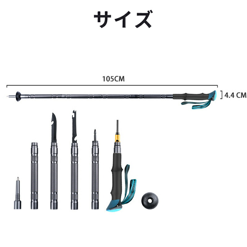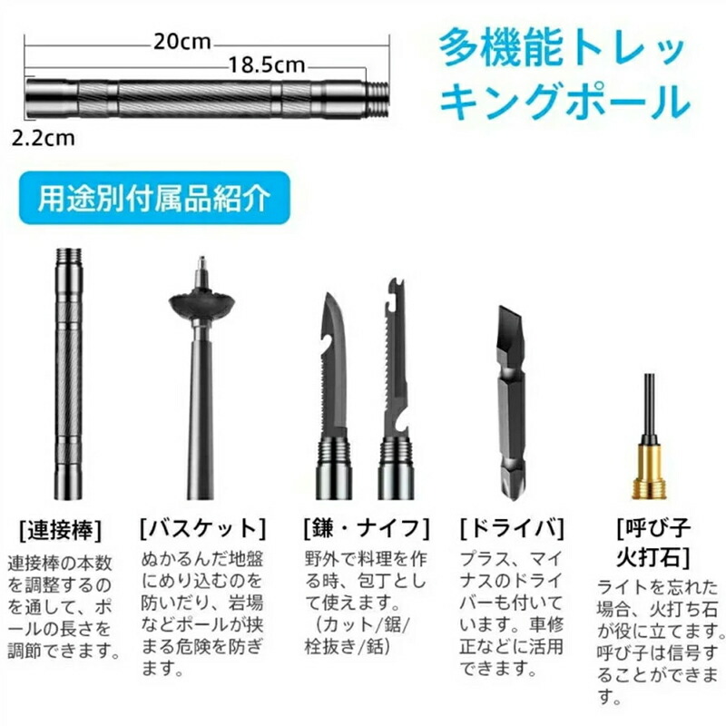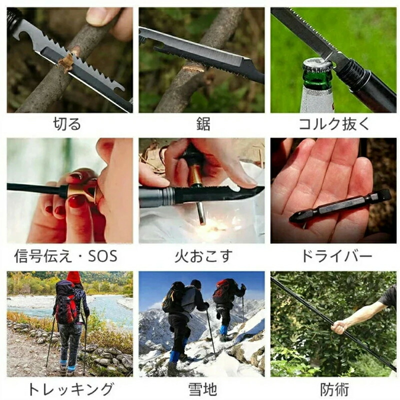 アップグレード版多機能トレッキングポール:全ての部品は別に各種ツールを組み合わせ出来ます。ナイフ、鋸、ドライバー、呼び子、火打石、コンパスなどの機能が付きますので、いろいろな状況を対応できます。アウトドアEDCツールとして、キャンプ、ピクニック、狩りに最適です。マッスルトレーニング、杖術、合気道、空の手に使用できます。