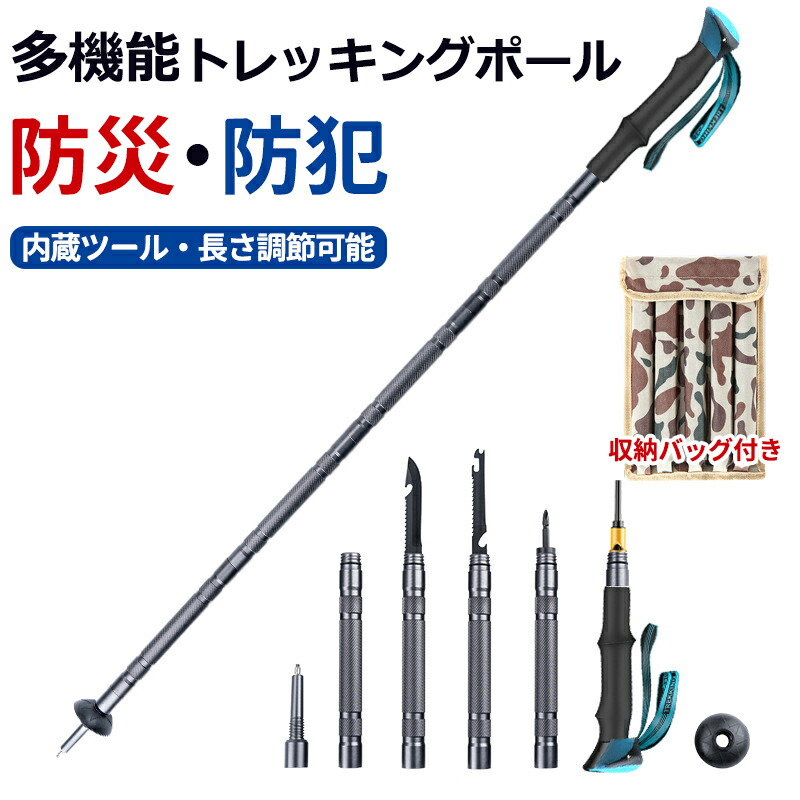 トレッキングポール 登山ストック アウトドア 多機能 衝撃吸収 アルミ合金製 軽量 防犯 護身用 サバイバル 山登り ハイキング 山菜採り 長さ調整可能 折りたたみ 携帯便利 収納バッグ付 組み立て式