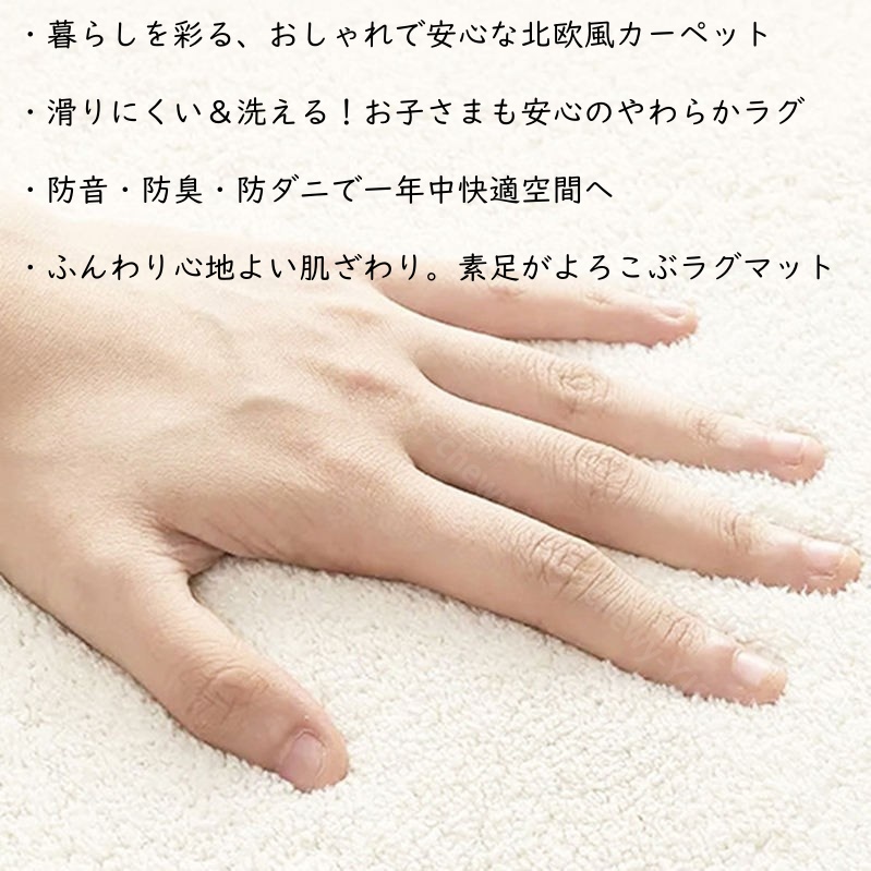 このカーペットは「滑りにくい裏地設計」「防音&防臭」「洗濯機対応」で、家族みんなが心地よく過ごせるラグマットです。