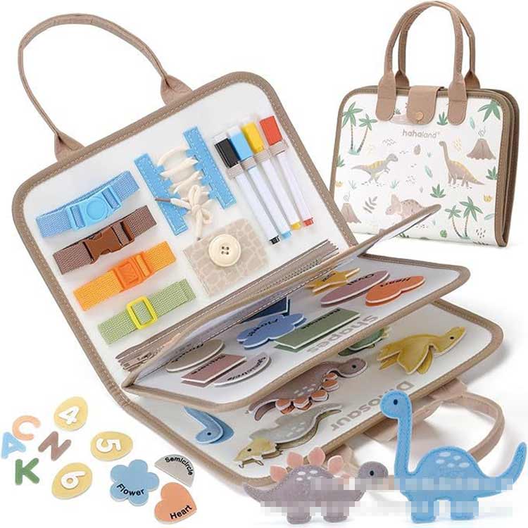 豊かなボタン、バックル、靴紐、ジッパーなどで遊べる、「ビジーボード」と呼ばれる知育用玩具です。一般に洋服についている留め具をまとめてあるオモチャで、子供の知力、創造性を刺激し、能力の開発に役立ちます。