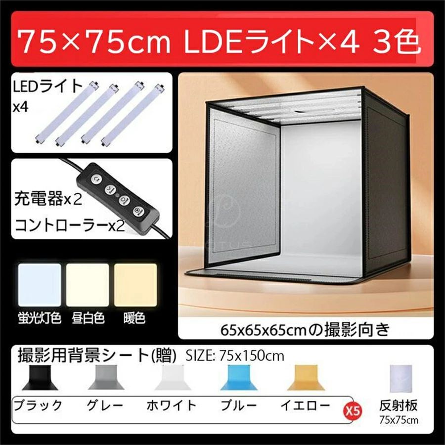 撮影キット 撮影ボックス LEDライト LDEライト×4 昼白色 LDEライト×4 3色 40cmx40cm 60cmx60cm 75cmx75cm