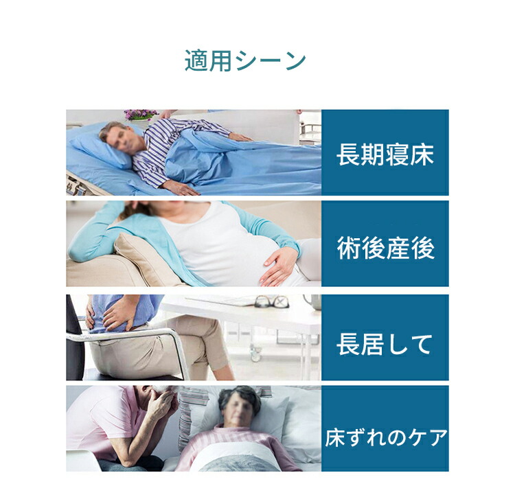 ・適用部位:寝たきりの人が横向き・横になる・座る姿勢の場合に、腰、膝、足首や背中の部位に適しています。 横になる対応部位:背中、尾骨、しり。 横向き対応部位:股の骨、腰骨。
