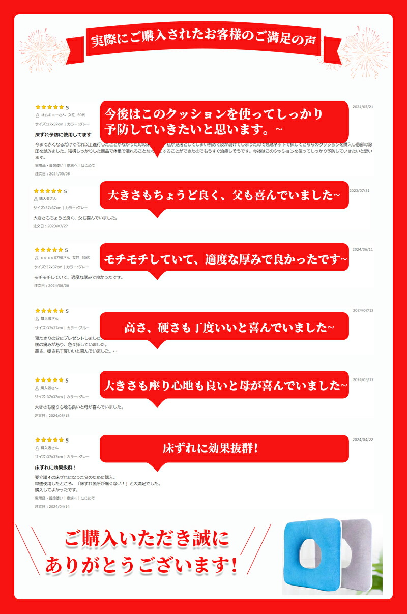 ・穴付き:穴付き中空のデザインは体への圧力を分散させ、通気である、床ずれ防止。しりを支え、痔疾患に向き良いデザイン。穴のおかげて、優しい肌触り、長い時間を座っても蒸れにくい、快適な座り心地を実現されます。