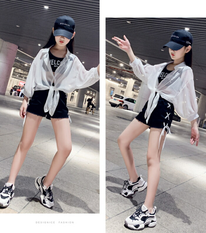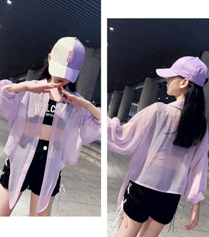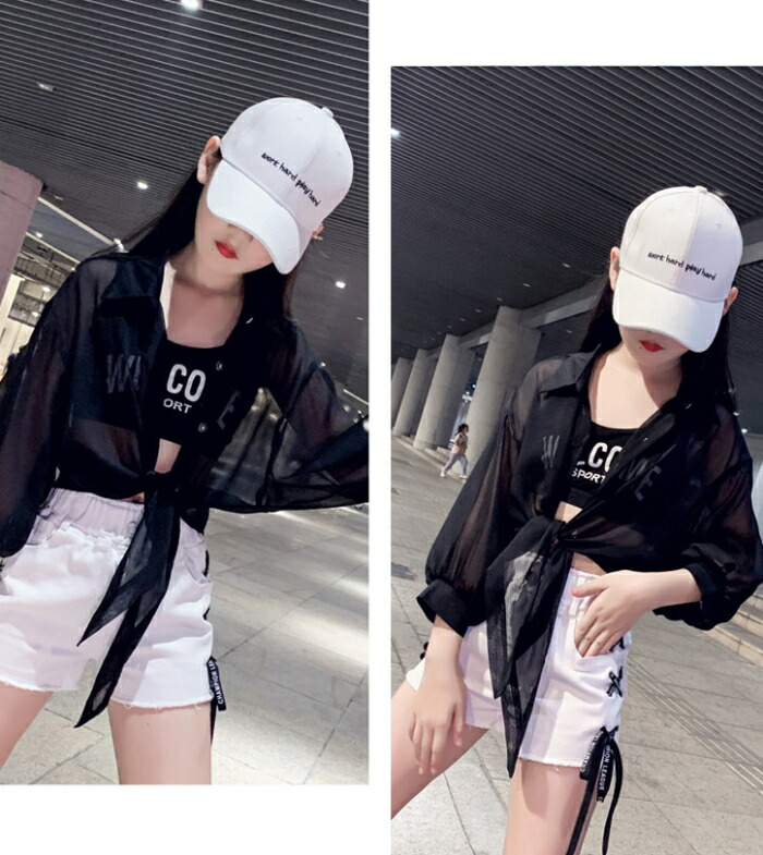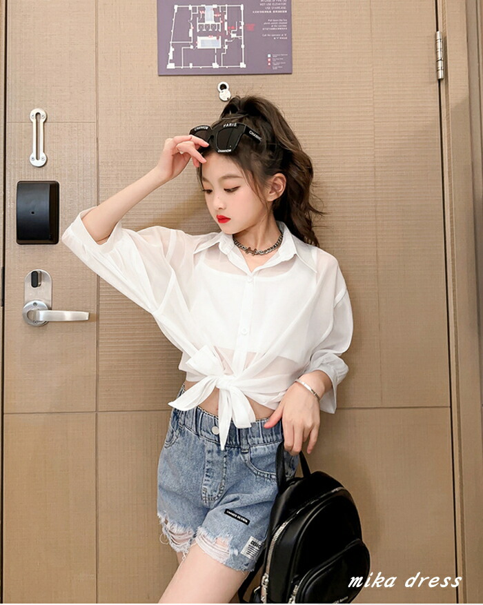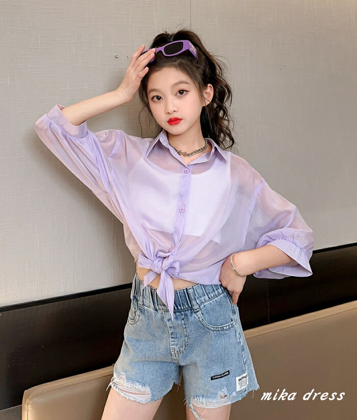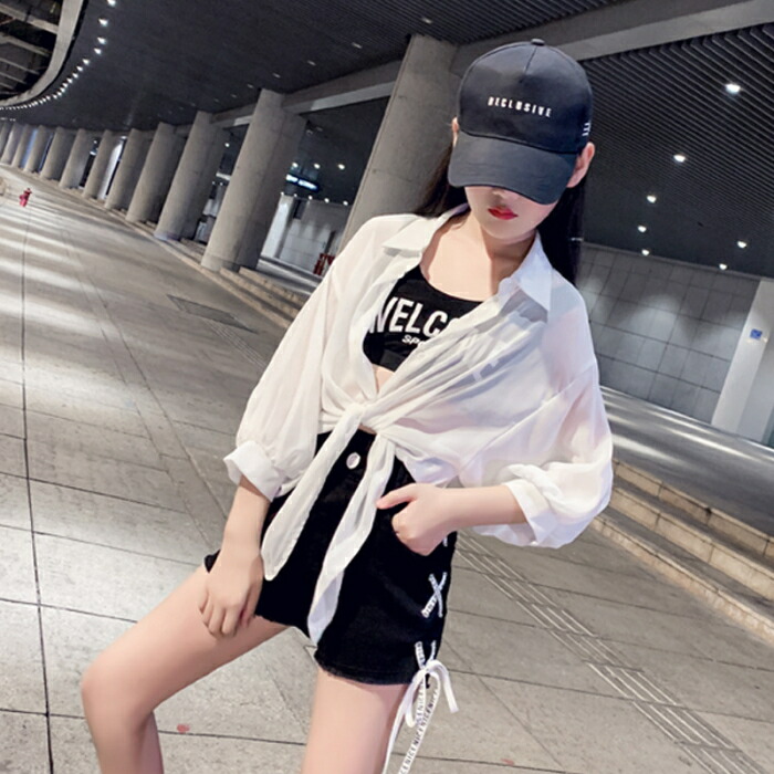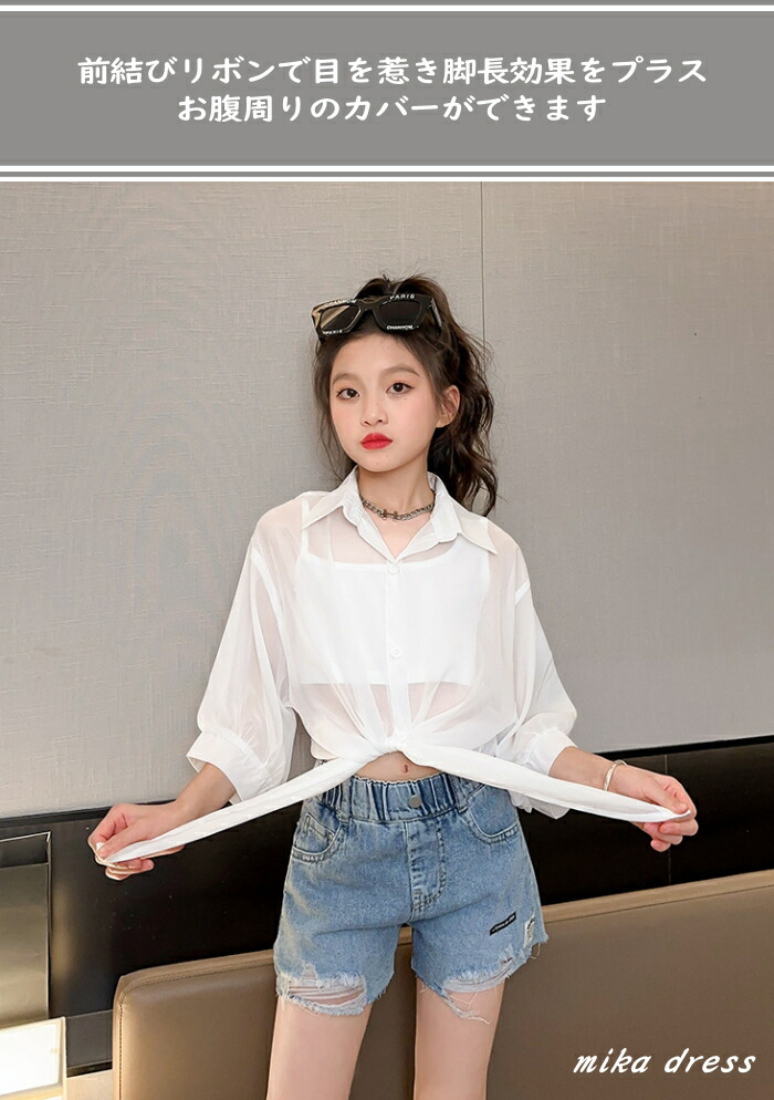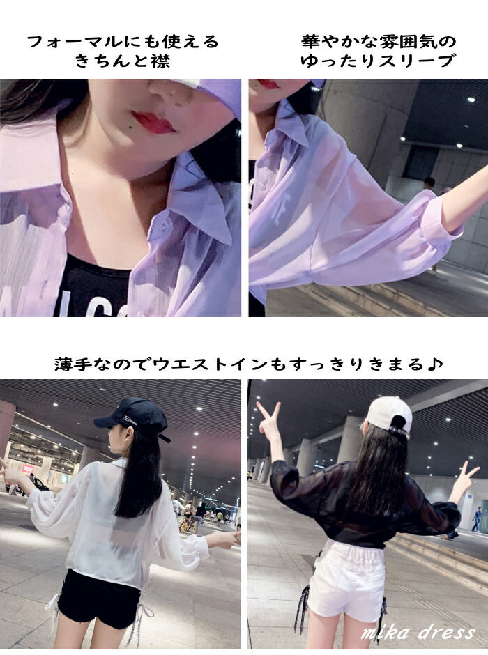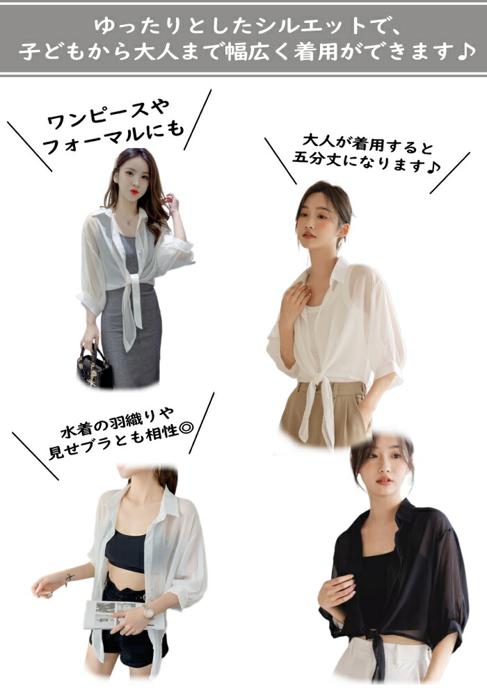 前結び シャツ キッズ 子ども 女の子 ショート丈 ボレロ シースルー シアー カーディガン ショートボレロ シフォン 襟付き ブラウス ドルマン バルーン へそ出し 7分袖 七分袖 リゾ 体型カバー