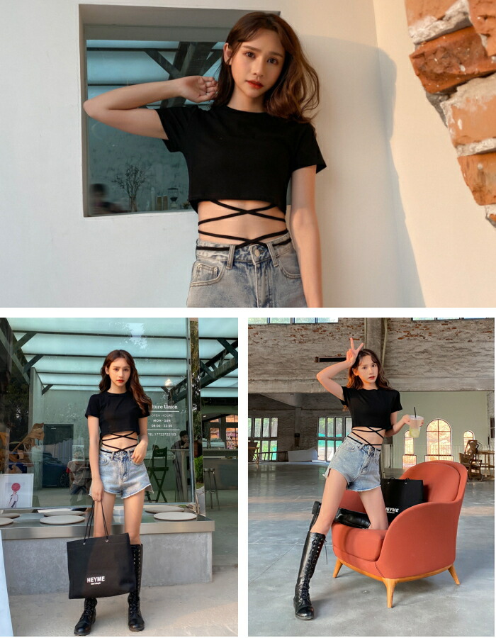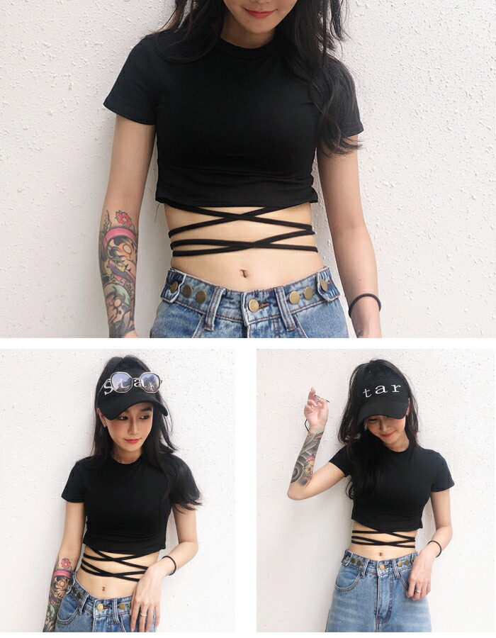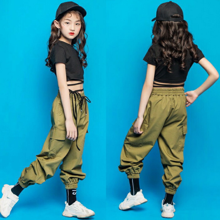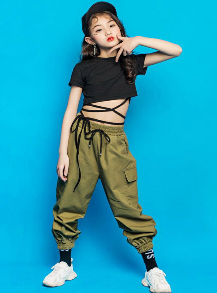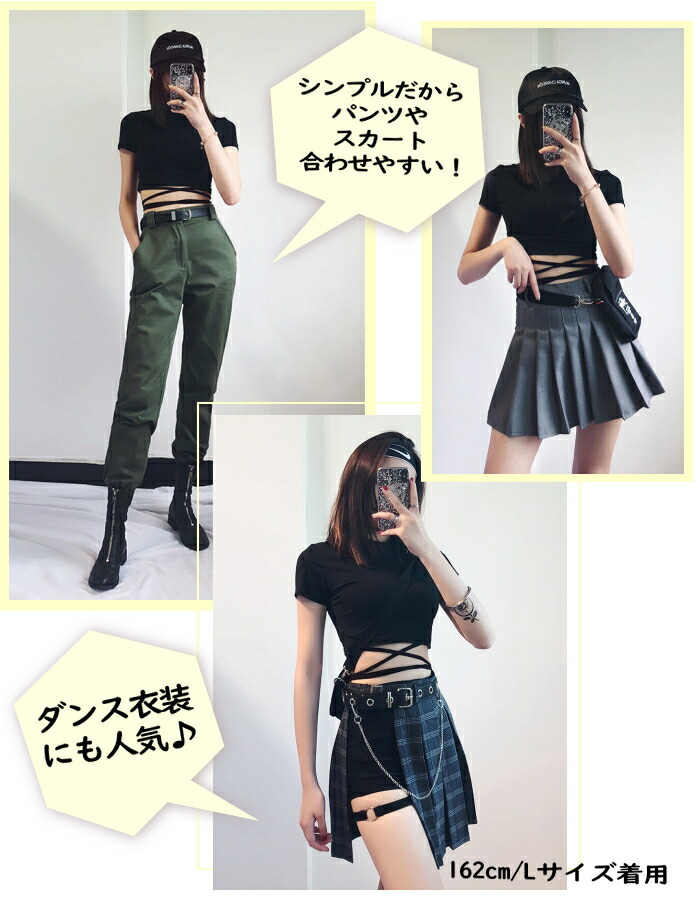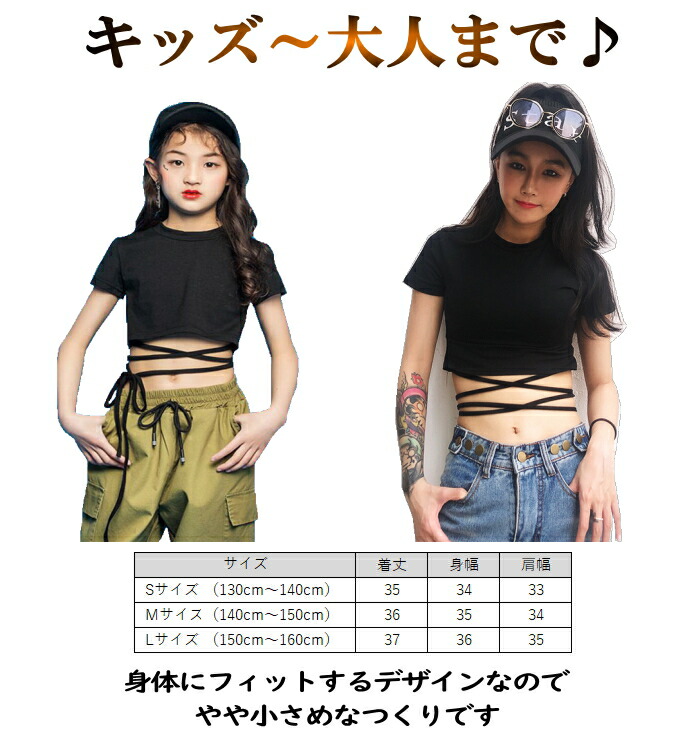 ショート丈 Tシャツ トップス ダンス 子供 キッズ ダンス衣装 黒 半袖 へそ出し チビT ミニT 韓国 おしゃれ クロス 編み上げ ハイネック スケーター 衣装 ストリート ヒップホ ステージ衣装