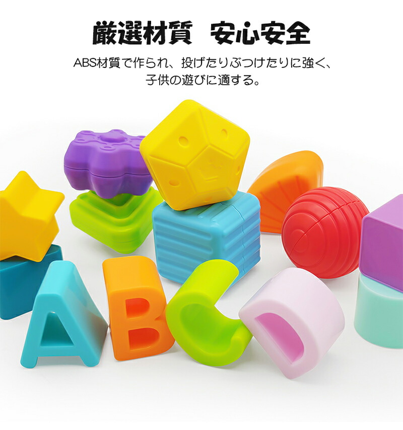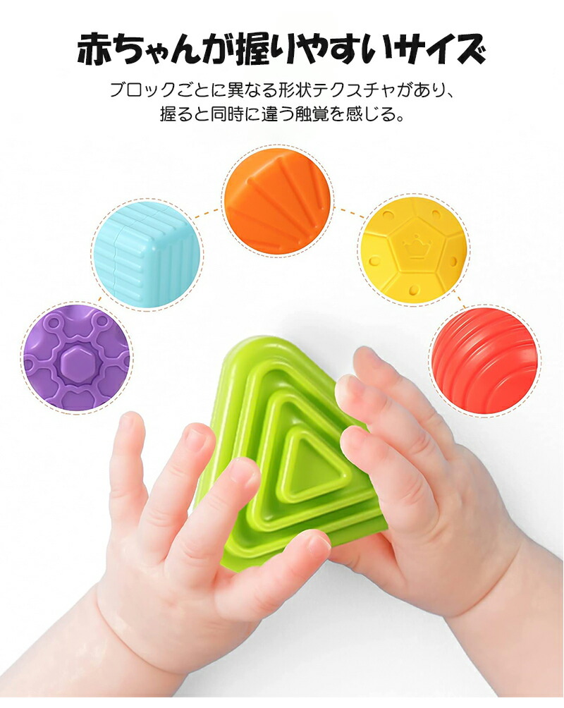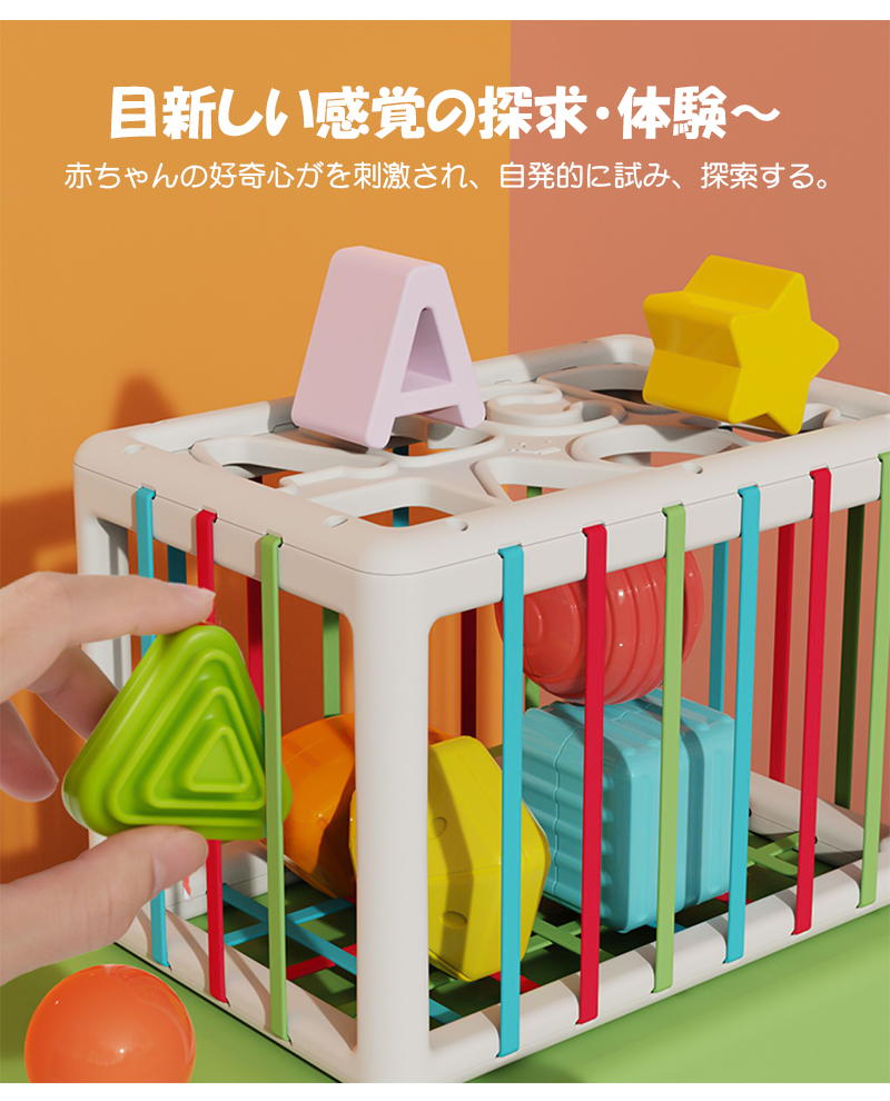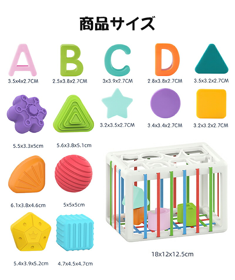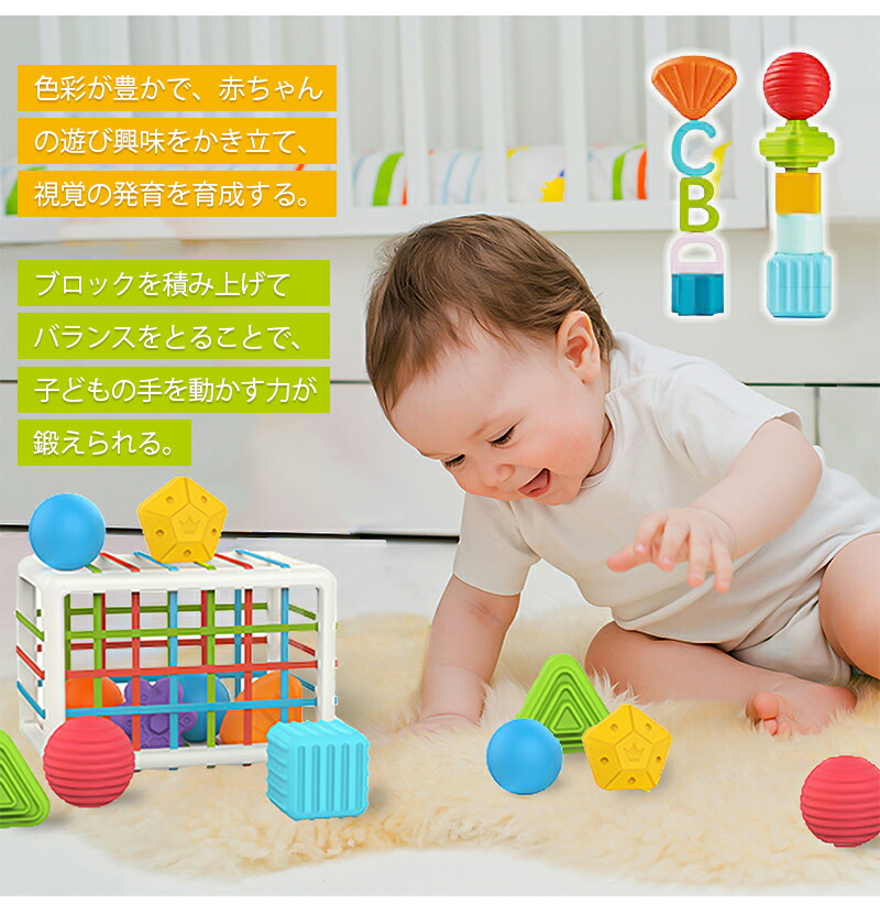 【豪華のセット】この赤ちゃんの形のソーターおもちゃは、色付きのゴムバンドが付いた感覚ボックス、8つ形状のブロックと、握りやすい6つの質感のある感覚ブロックで構成されています。 赤ちゃんは、他のABCDの形を正確に合わせる方法、おもちゃを取り出して交換する方法を学びます。これにより、問題解決能力や形と色の認識能力だけでなく、細かい運動能力と器用さも発達します。。