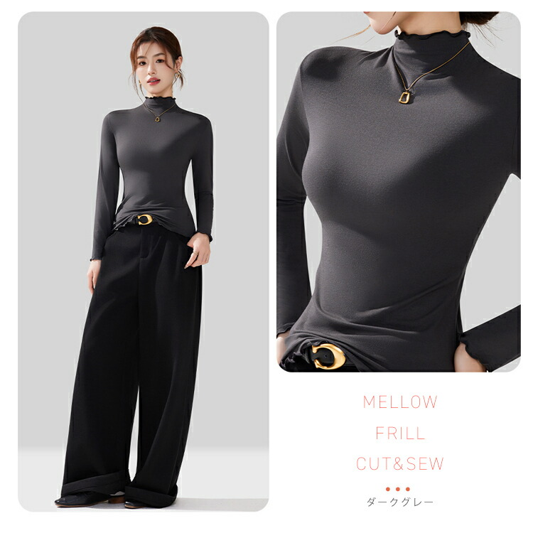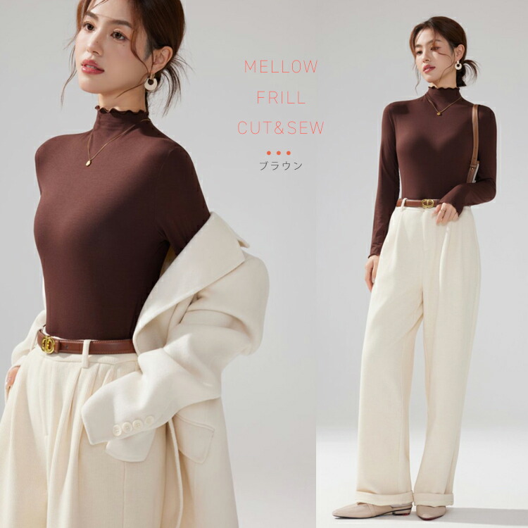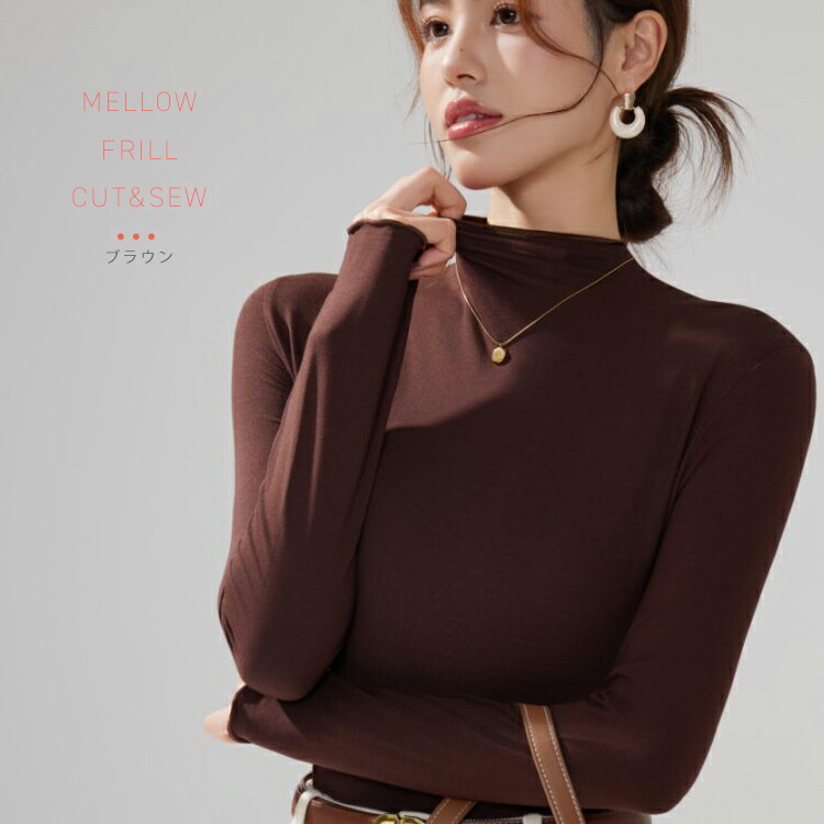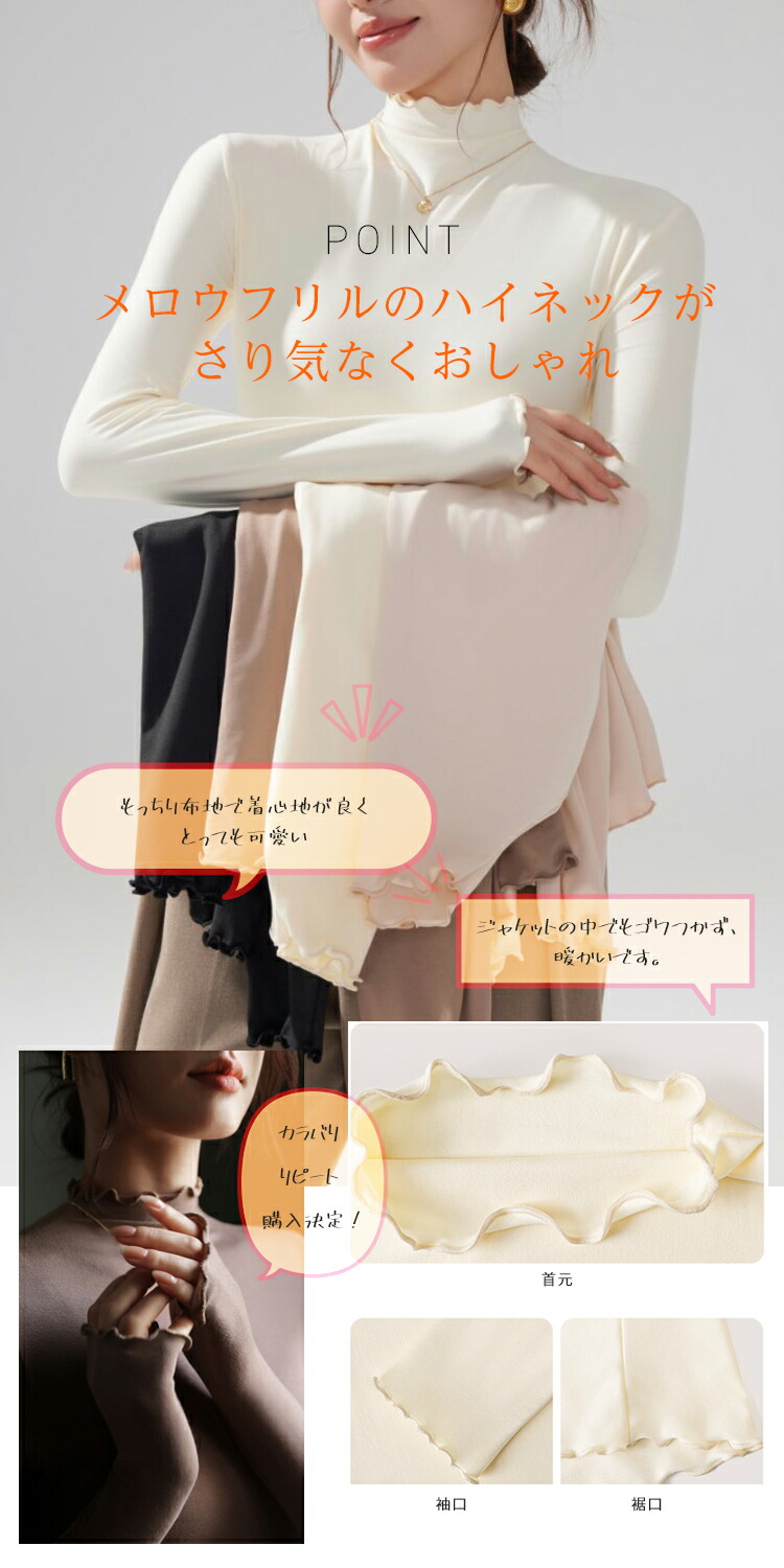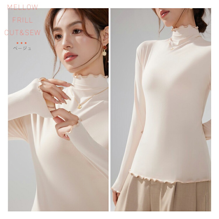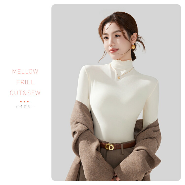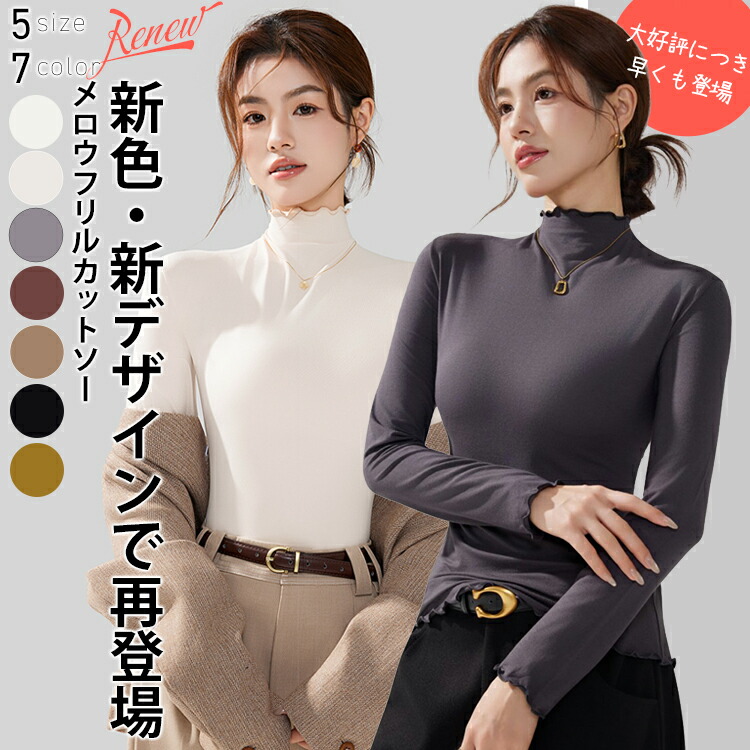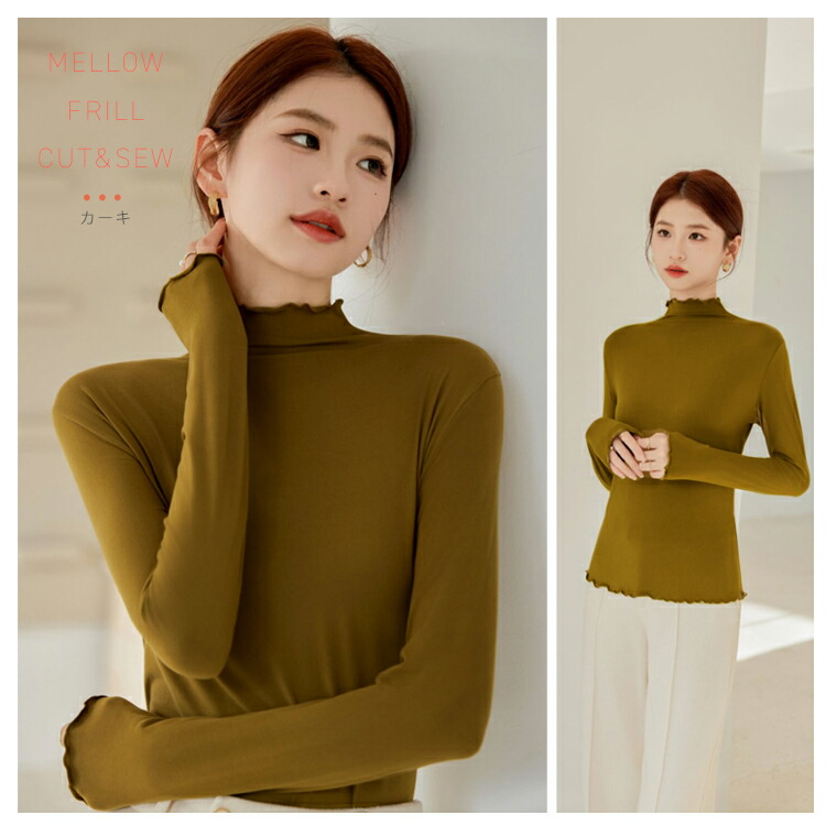 新デザイン新色 ハイネックカットソー ハイネックプルオーバー メロウフリルレディース トップス タートルネック タイトシルエット ロンT 重ね着インナー 起毛 インナー ヒートウェア 長袖 柔らかい