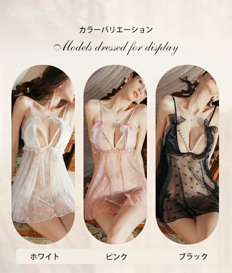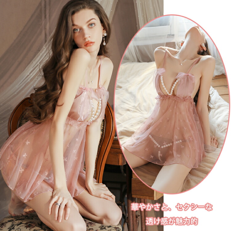 セクシーランジェリー 超過激 2点セット スケスケ ベビードール パール付き Tバック セクシーワンピ セクシー ランジェリー 大人 可愛い チュールリボン ワンピース エロい下着 セクシーラ パール