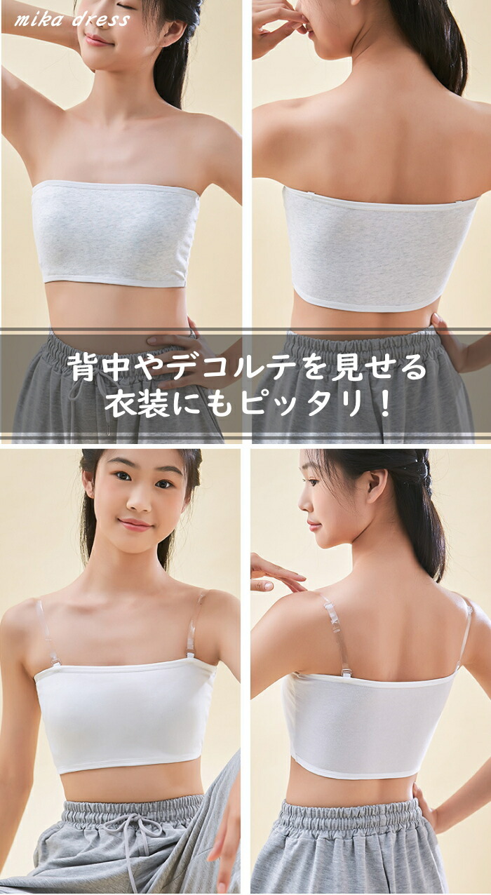 シンプル無地のチューブトップブラです。 伸縮性のあるノンストレスな着心地で体にフィット。固定パッドが安定しているのでブラジャーがまだ早いキッズのスポーツブラやブラトップに。