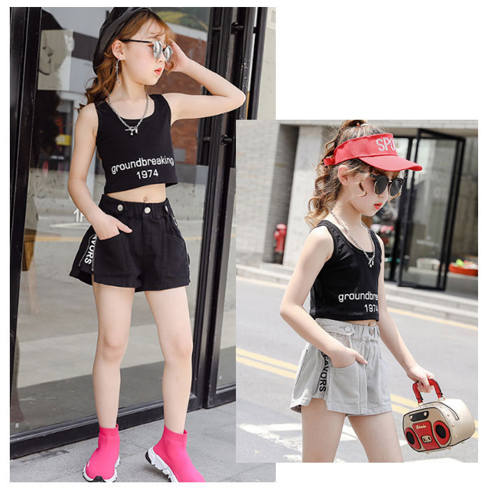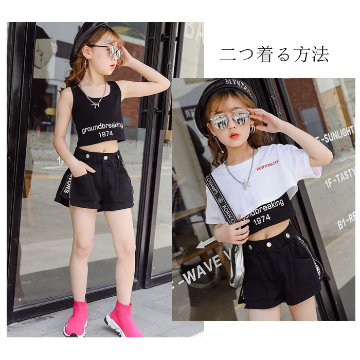 韓国子供服 女の子 夏服 ショートTシャツ+ベスト カジュアル ファッション キッズ ガールズ ダンス衣装 トップス 白いTシャツ 丸首 半袖 黒のベスト コーデ 普段着 ジュニア服 オシャレ 110cm 120cm 130cm 140cm 150cm 160cm ダンス衣装 子供服 トップス チア へそ出し