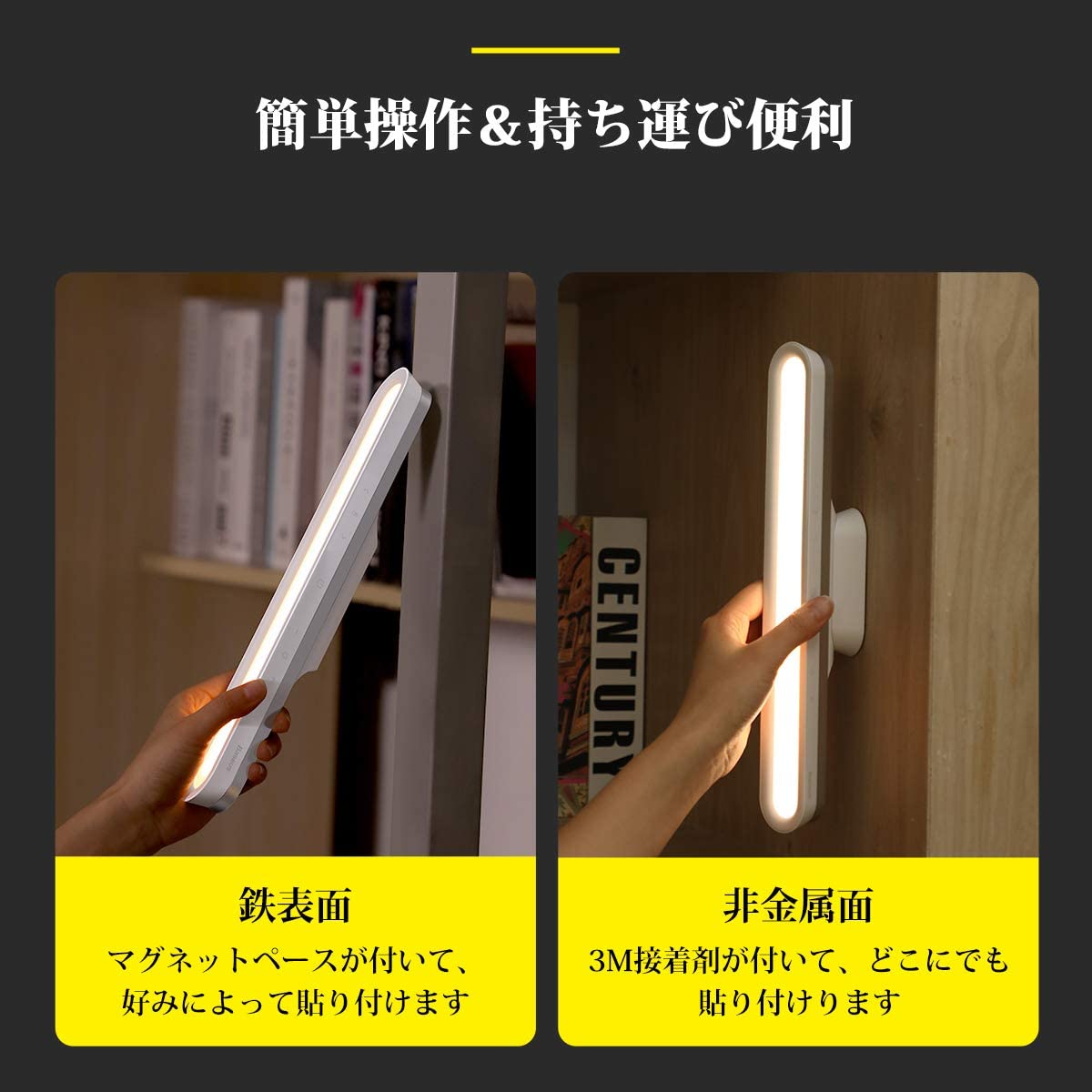 マグネットベースと3M接着剤が付いて、 工具、ネジ、ナットは必要ではなく、鉄表面あるいは非金属面に付着できます。ペースから簡単に取り外すことができ、懐中電灯として使用できます。