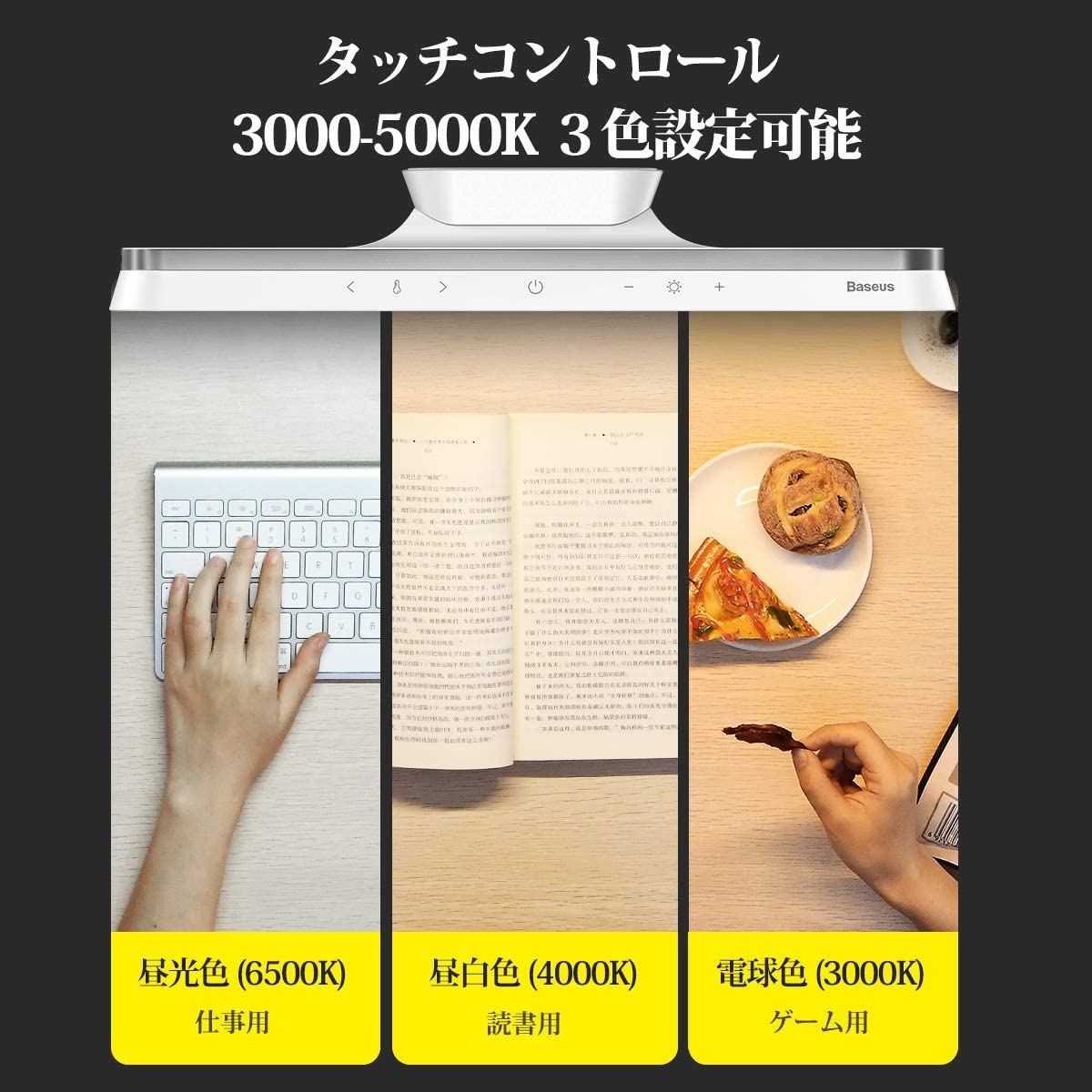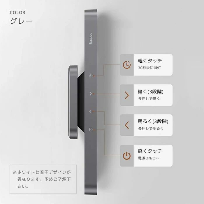タッチコントロールにより、ワンタッチするとオン/オフにし、長押すと100%~20%の照明輝度を調整できます。デスクライトは電球色(3000K)、昼白色(4000K)、昼光色(6500K)の3色オプションになり、いつもお好きな照明色を選択できます。
