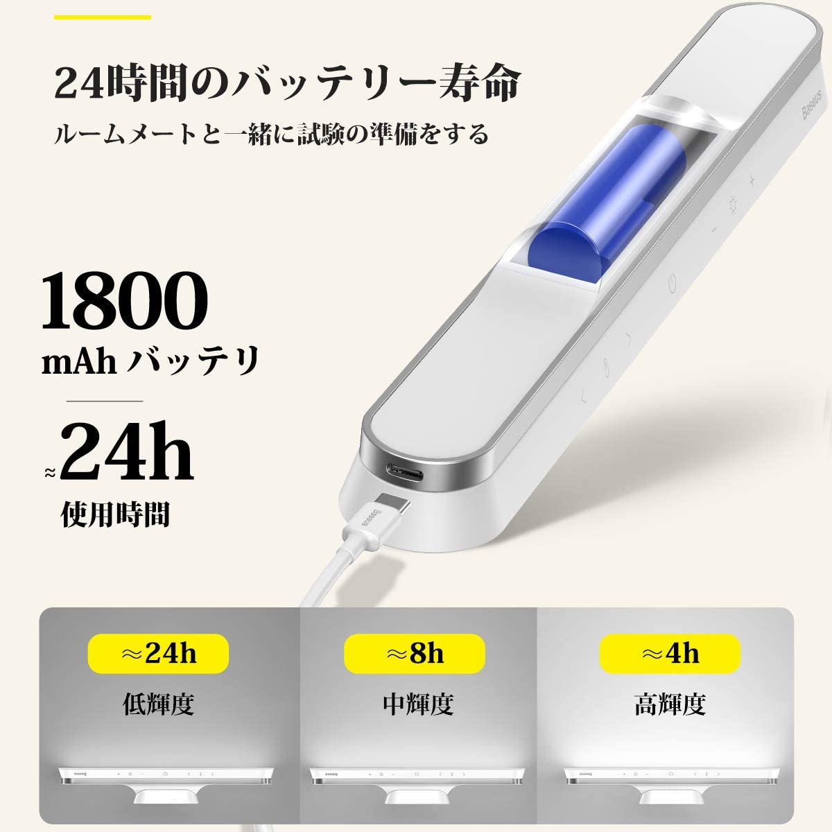 読書灯が内蔵電池(1800mAh)があり、配線不要ままに使用できます。USB充電式のタイプで4~5時間でフル充電されて、卓上ライトは4~24時間に使うことができます(使用時間は輝度設定による)。内蔵電池は再利用でき、環境に優しい、持ち運びにも便利です。