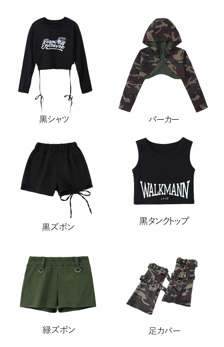 アイド 女の子 足カバー パンツ ショ スポーツ アウトドア 通販 パーカーのみ 黒シャツのみ 黒タンクトップのみ 黒ズボンのみ 緑ズボンのみ 黒シャツ+緑ズボン+足カバー パーカー+黒タンクトップ+黒ズボン パーカー+黒ズボン+足カバー 110cm 120cm 130cm 140cm 150cm 160cm 170cm 180cm
