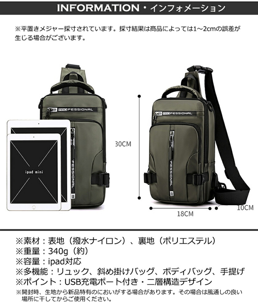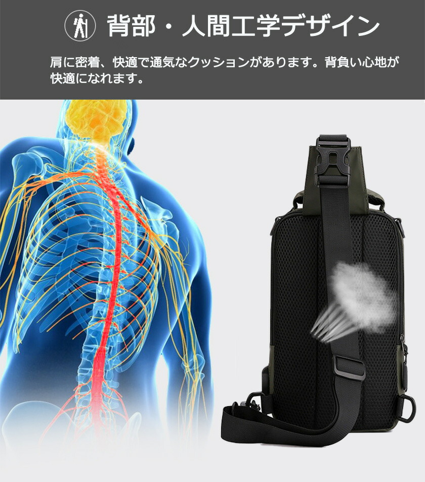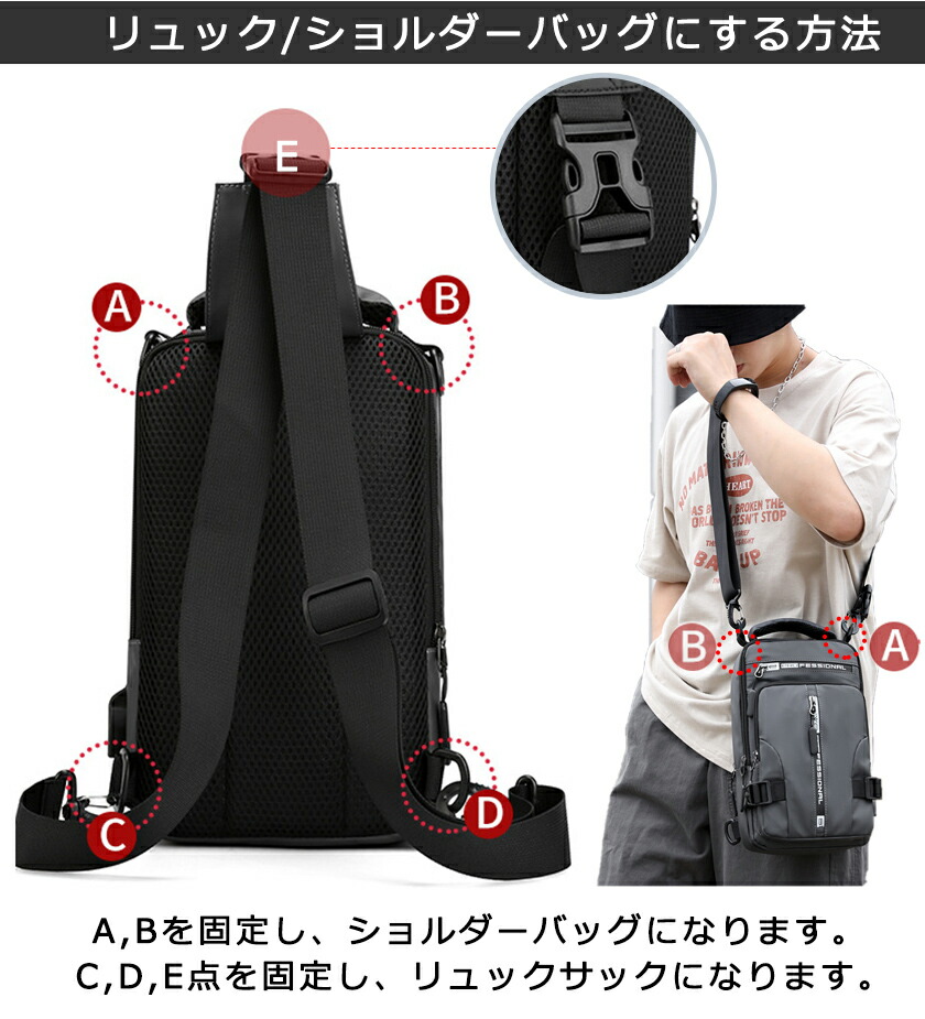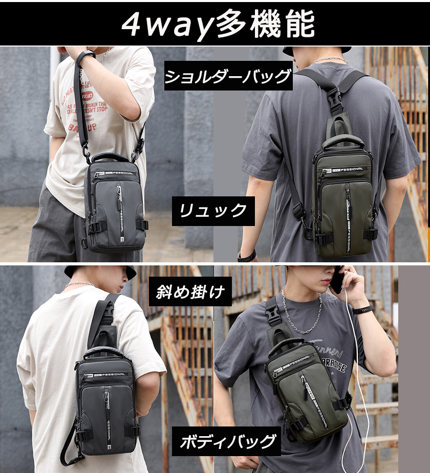 一部ボディバッグ メンズ 4way ショルダーバッグ ボディ-バッグ 斜めがけ 大容量 リュックサック 肩掛け USBポート付き 撥水 軽量 多機能 スマホ収納 通勤バ iPad対応