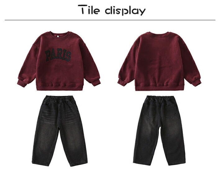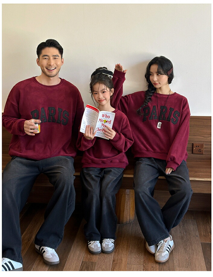 ワインレッド フリース 裏起毛 トレーナー スウェット 家族 親子 お揃い カップル ペアルック 秋 冬服 親子コーデ ジーンズ デニムパンツ ブラック ズボン レディース 男の子 女の子 パ メンズ