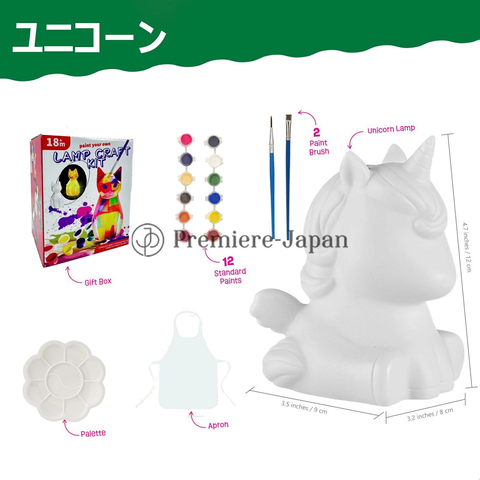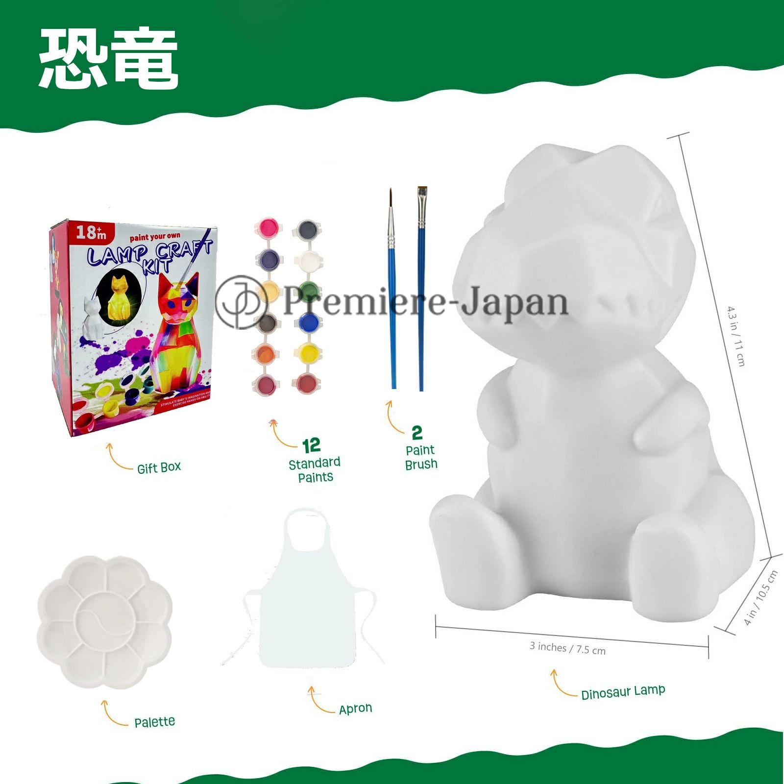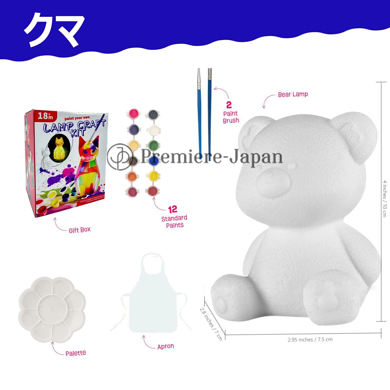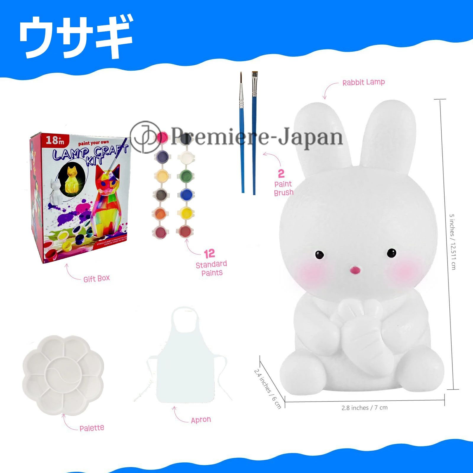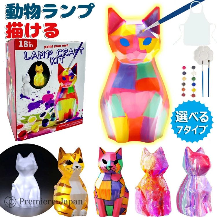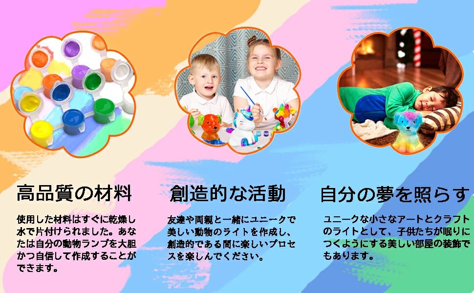 「セット内容」動物ランプ、画筆2本セット、パレット1個、エプロン1枚、絵の具×12色がセットになっています子どもたちはそれぞれ自由に色を塗り、楽しみながら個性的なランプを作り上げます。同じ動物でも色の違いで全く異なる印象に仕上がり、さらにライトを点灯するとまた違った雰囲気が楽しめるのが魅力です。