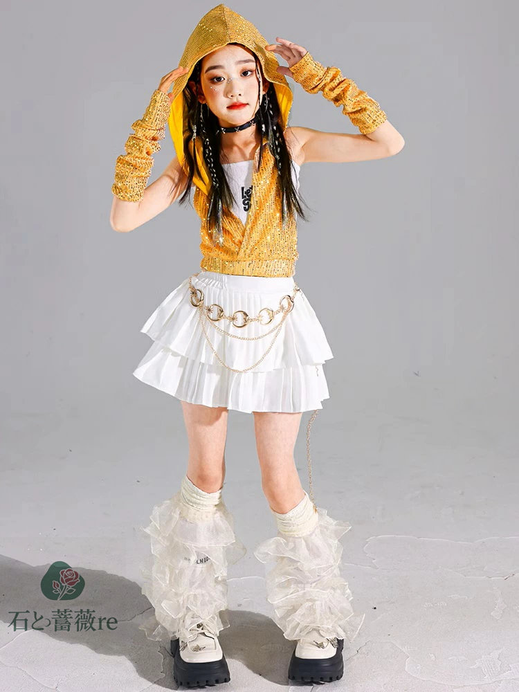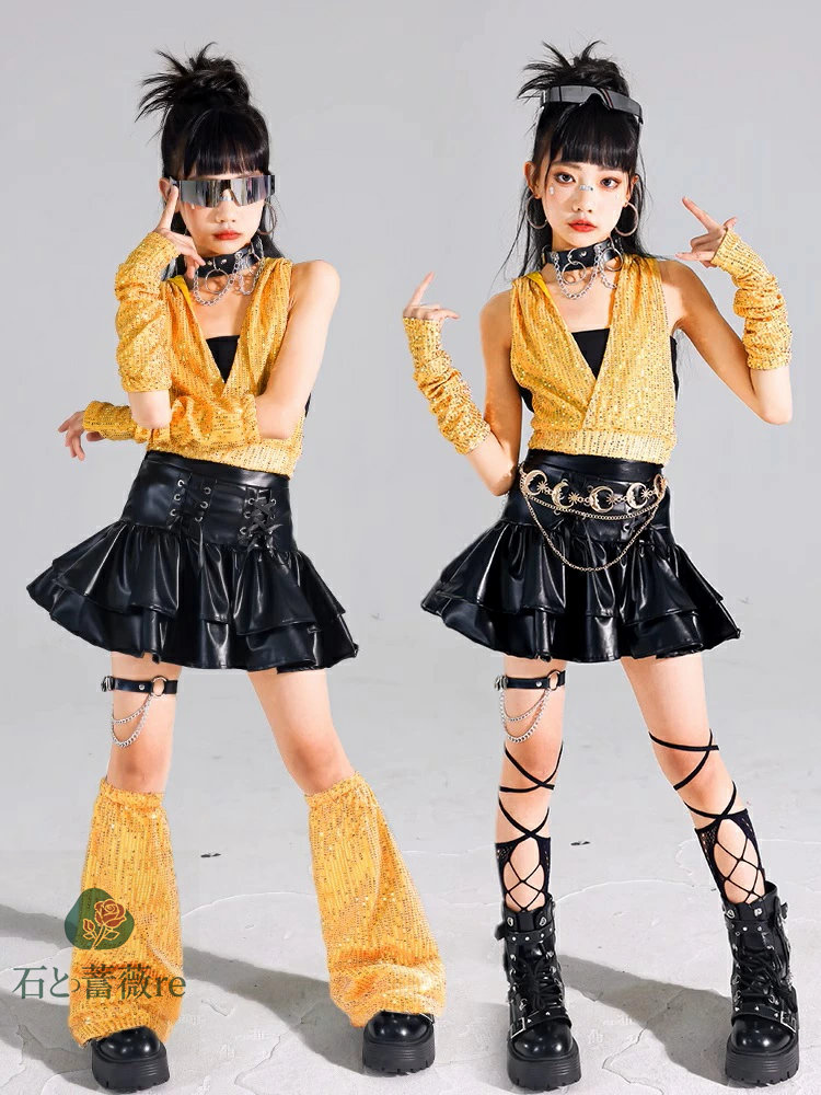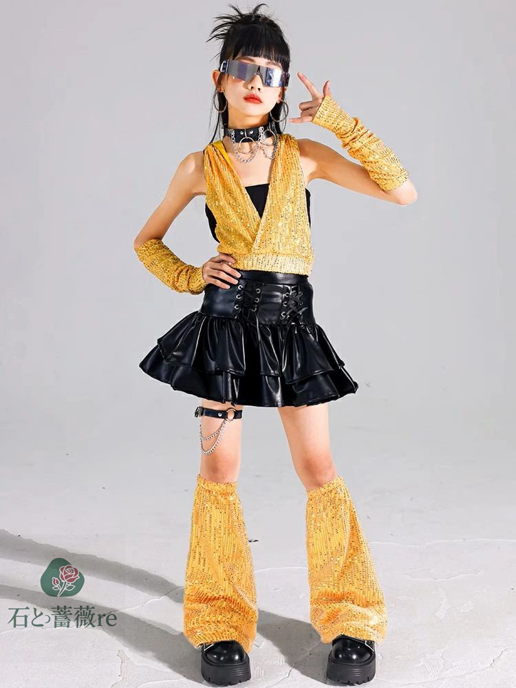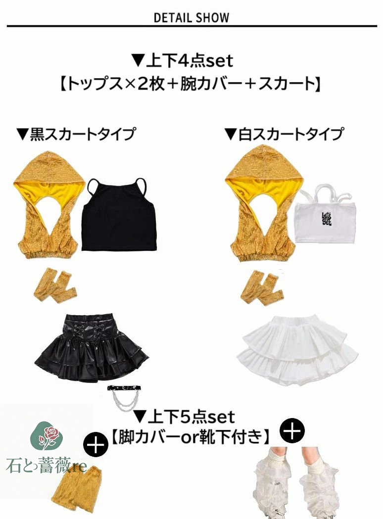 ダンス衣装 ガールズ 衣装 ゴールド スポーツ アウトドア 人気 黒スカートタイプ上下4点set 白スカートタイプ上下4点set 黒スカートタイプ5点set脚カバー付 白スカートタイプ5点set(靴下付き) トップスのみ(黒インナー付き) トップスのみ(白インナー付き) 黒スカートのみ 白スカートのみ 110サイズ 120サイズ 130サイズ 140サイズ 150サイズ 160サイズ 170サイズ