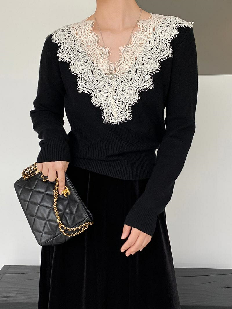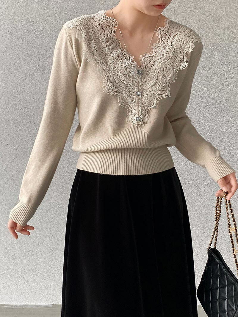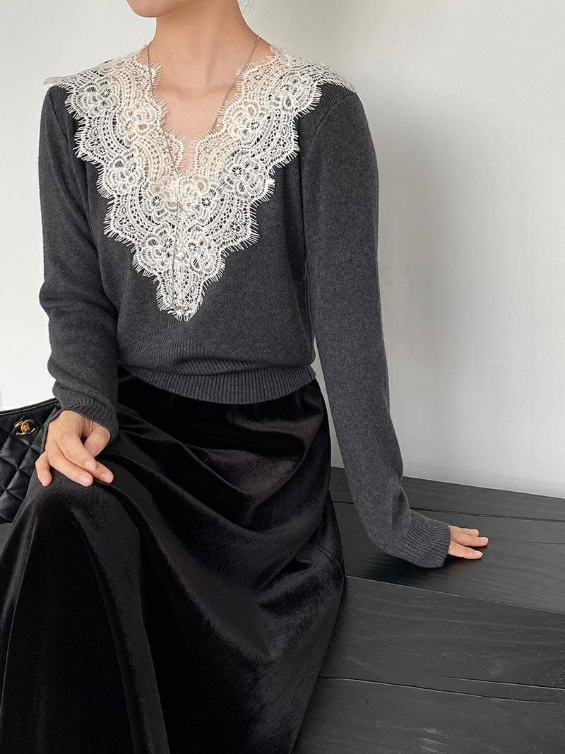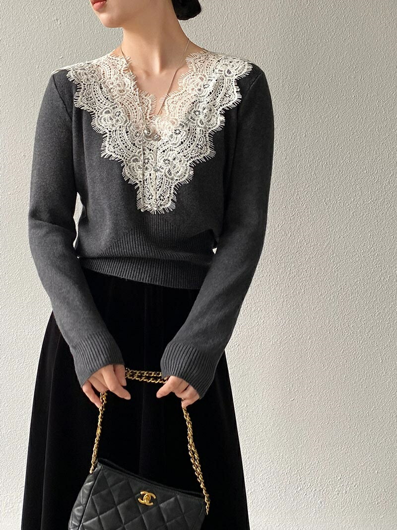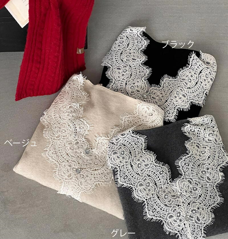 Vネックレースニット Vネックニット レディースファッション 早い者勝ち!ポイントUP グレー ベージュ ブラック