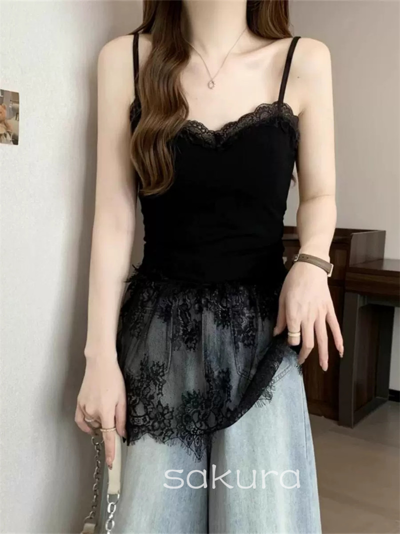 黒 ブラック ホワイト 白 レディース 重ね着風 着回し レイヤードTシャツ スリットレイヤードTシャツ 体系カバー レイヤードキャミ スリットレイヤードキャミソール ノースリーブ タンクトップ 袖なし 下着 無地 シンプル 肩紐 調節可能 ラウンド 裾ラウンド カジュアル ストリート レース 切替え ドッキング S L おしゃれ お洒落 オシャレ かわいい 可愛い カワイイ クリスマス 春夏 春 夏 秋 冬 秋冬 20代 30代 40代 50代 新作 新着 サクラ SAKURA
