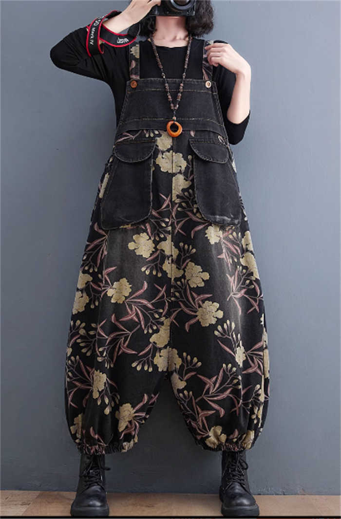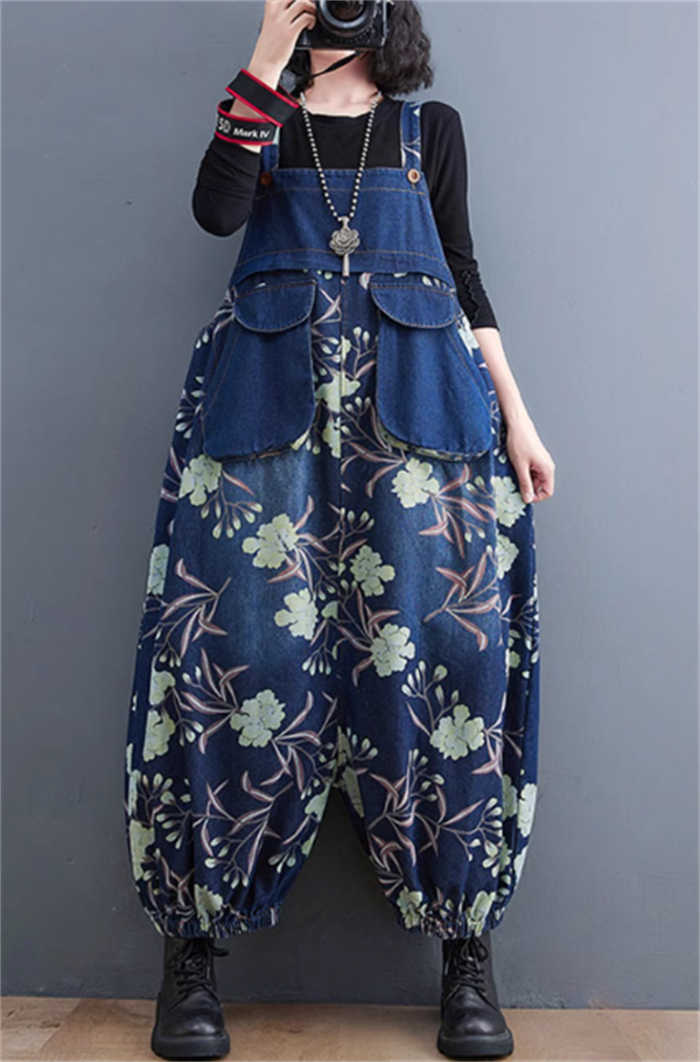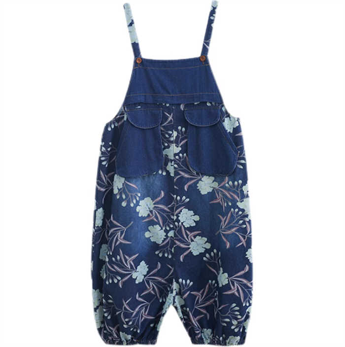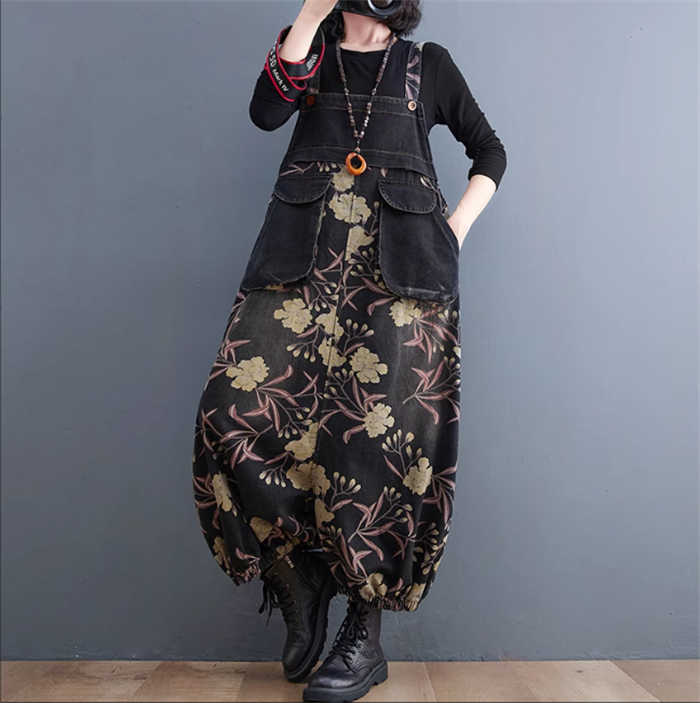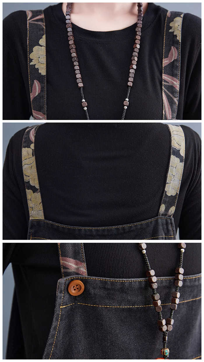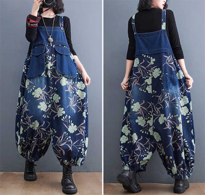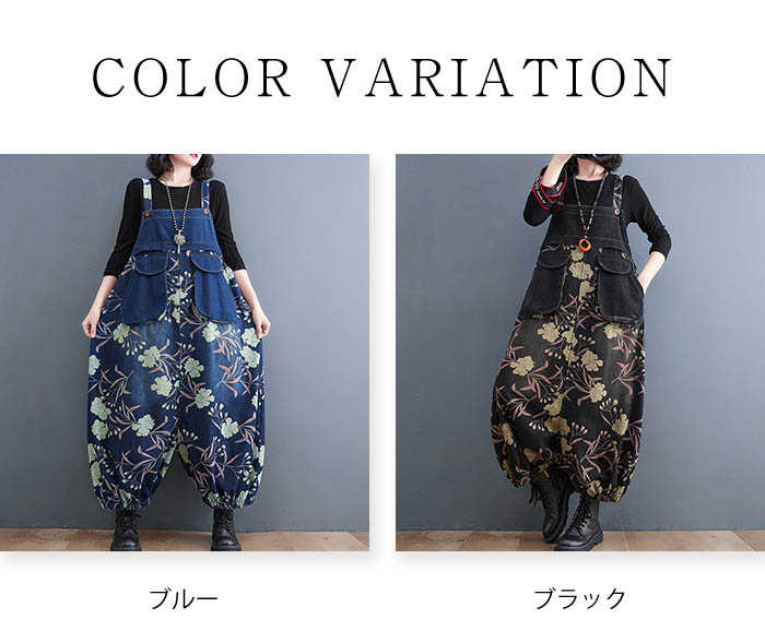 パンツドレス デニムパンツ 花柄切り替 レディースファッション 新作 ブルー ブラック M L XL 2XL