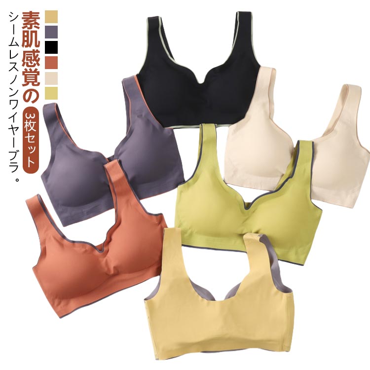 3枚セット ノンワイヤーブラ シームレ レディース インナー 下着 ブラジャー 人気 イエロー グレー ブラック ブリックレッド ベージュ グリーン M L XL 2XL