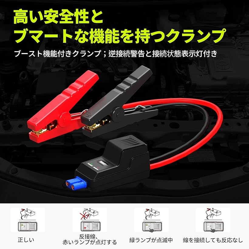 カーバッテリに簡単に接続だけで、瞬時に車を始動できます。
