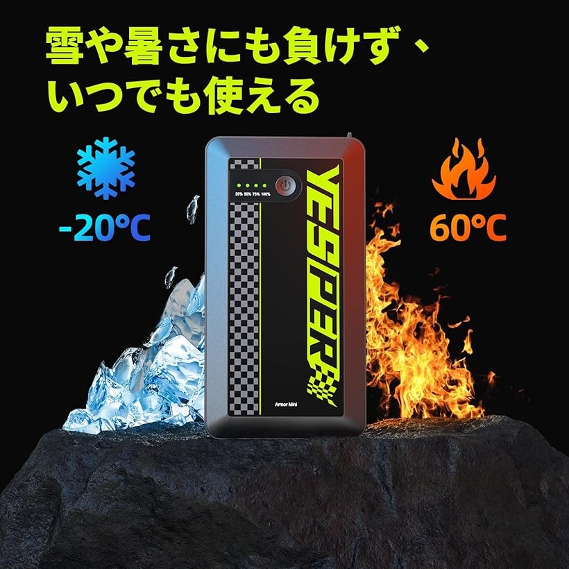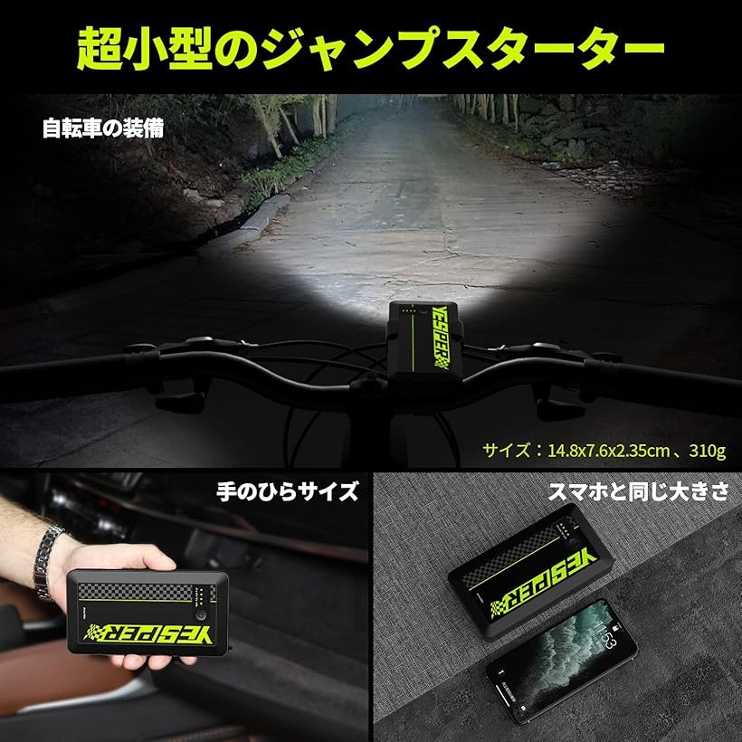 「バッテリー保護&PSE認証」YESPER小型ジャンプスターターは、310gという軽量ながら、世界トップクラスの性能と安全性を実現しています。