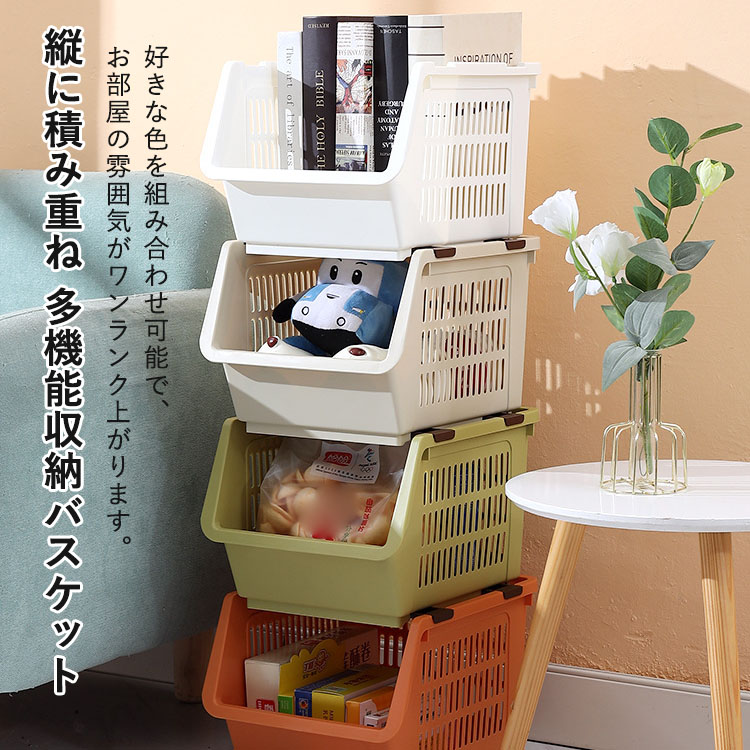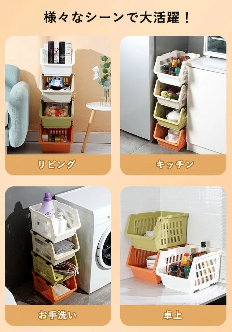 積み重ねバスケット 積み重ねラック 野 ホワイト4個 オレンジ4個 グリーン4個 ベージュ4個 4色各1個 ホワイト2個+オレンジ2個 ホワイト2個+グリーン2個 ホワイト2個+ベージュ2個 オレンジ2個+グリーン2個 オレンジ2個+ベージュ2個 グリーン2個+ベージュ2個 自由に組み合わせる4個 M L