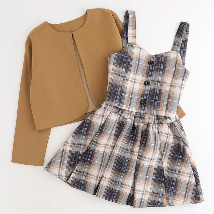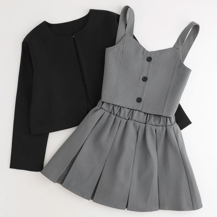 ベーシックなボレロジャケットとツイル素材のビスチェ&プリーツスカートの3点セットアイテム。