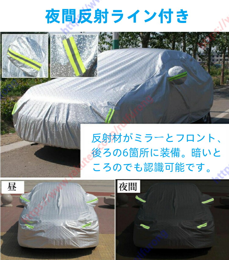 【強風対策】:強風や台風でカバーが飛ばないように設計を見直しました。カバーのフチにはゴムが施されており、車をしっかりとキャッチします。また、付属の防風ベルト2点セットを併用すれば更に安心です。
