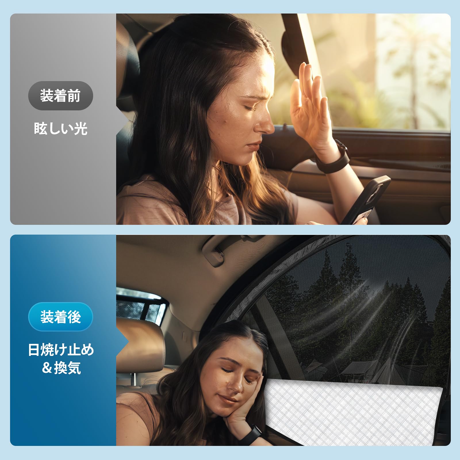 【窓へ影響無し&多用途】簡単に取り付けられ、窓の開閉にも影響を与えません。外から車内は見えなく、プライバシーをバッチリ守ります。防犯対策や車中泊、車内での食事、ピキャンプ、お昼寝などには最適です。