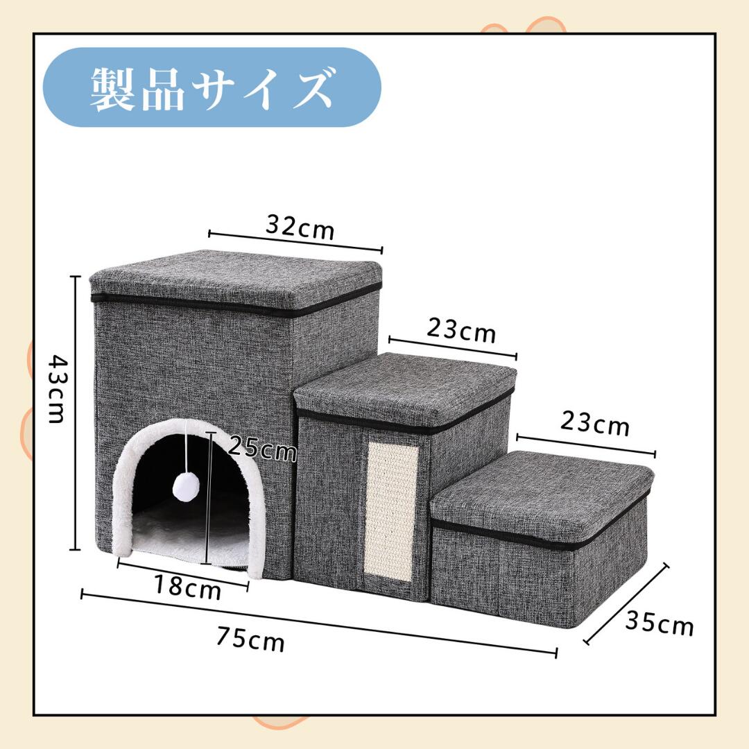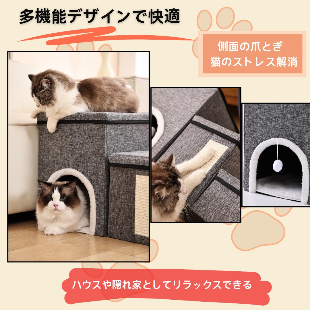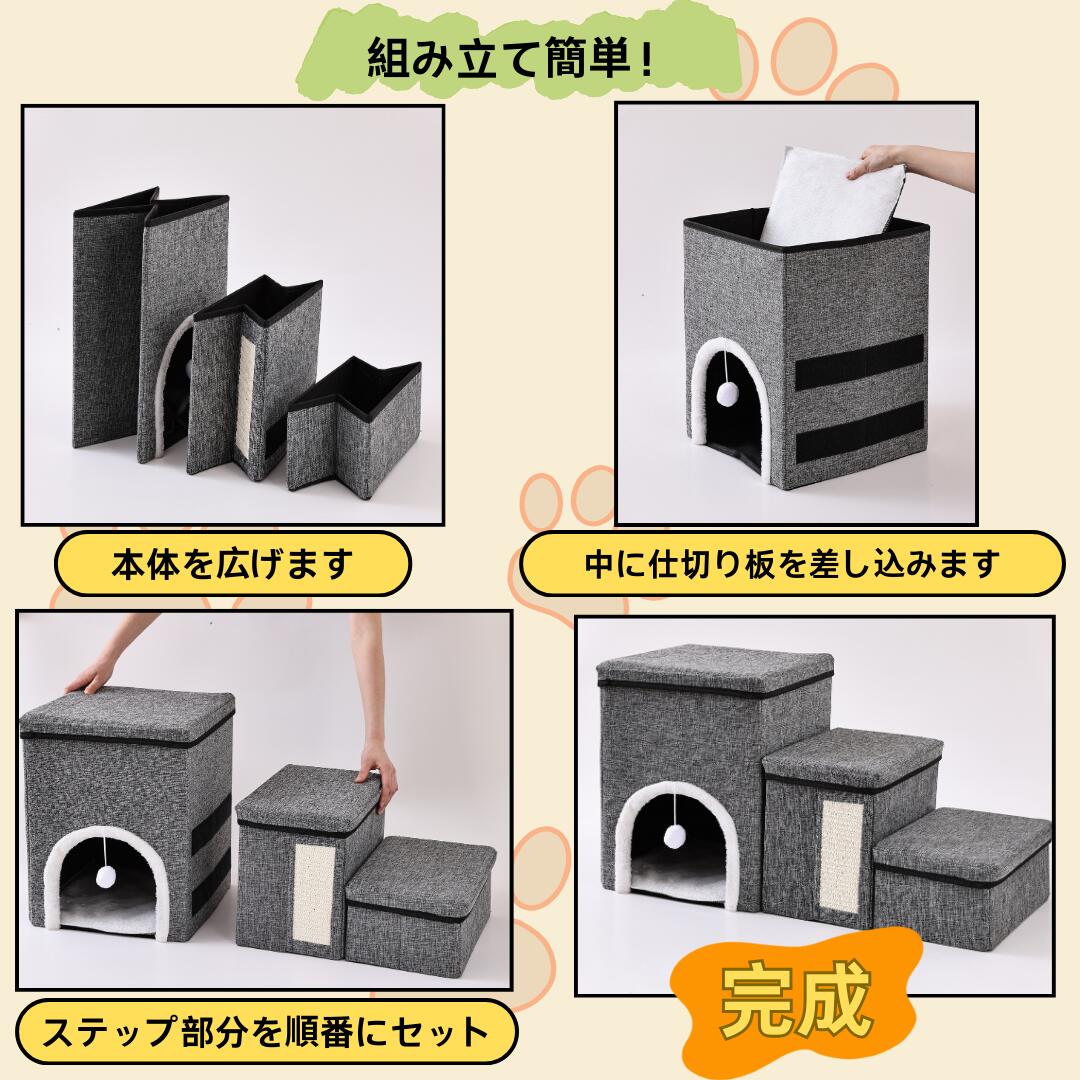 多機能型のペット用ステップです。階段としてベッドやソファへの上り下りをサポートするだけでなく、内部はペットハウスや収納スペースとしても活用できます。分割して単独使用も可能で、お部屋のレイアウトや用途に合わせて自由に調整できます。
