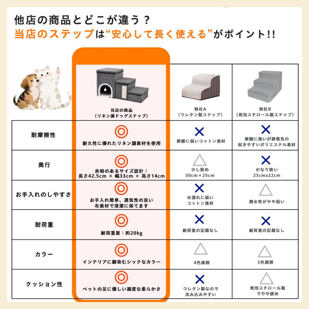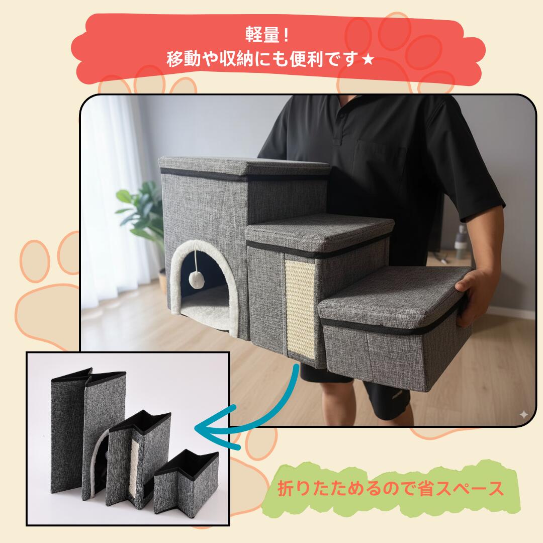 また、ステップ側面には爪とぎ用の麻生地を採用し、猫ちゃんの遊び場としても最適。小型犬・猫・ウサギなど幅広いペットに対応しています。