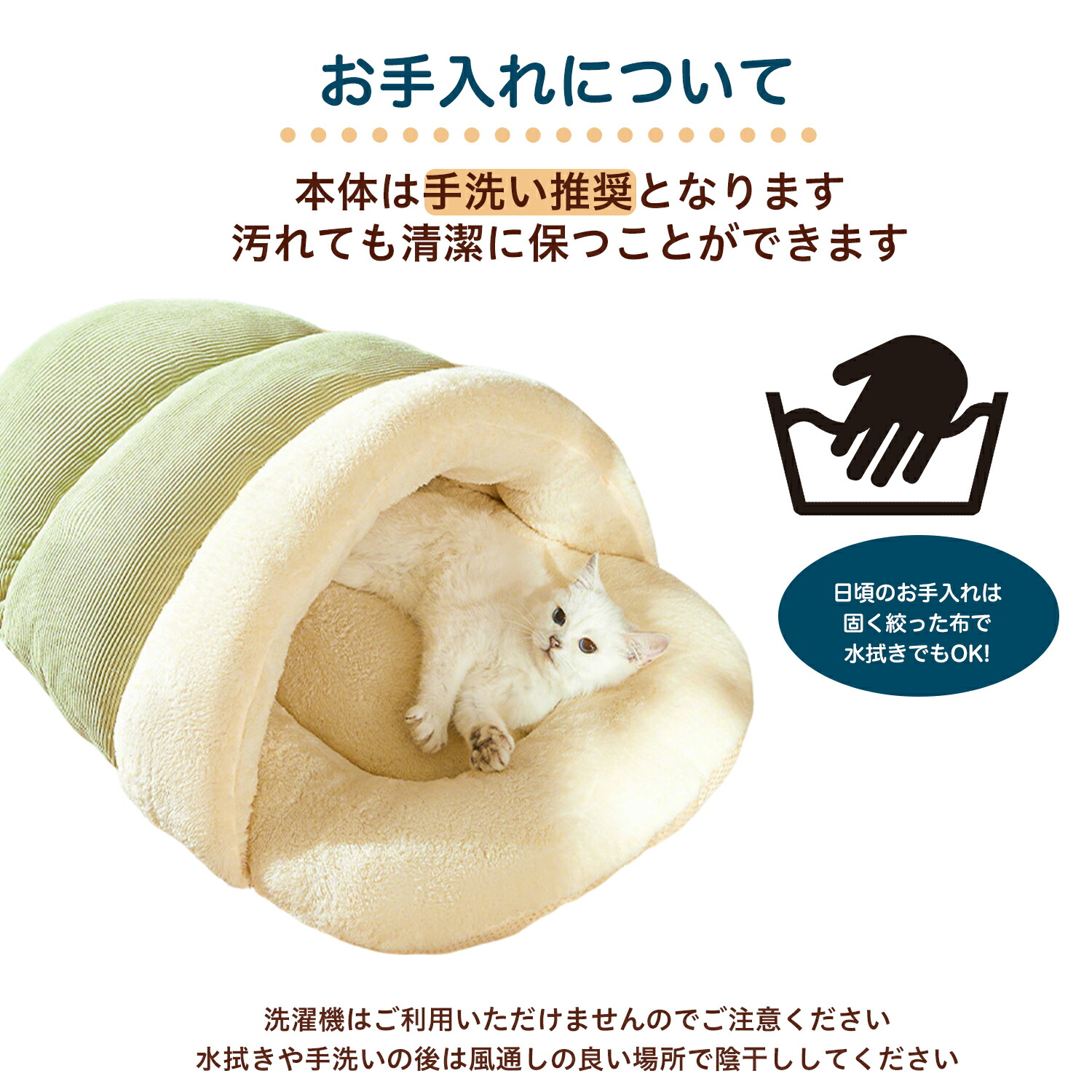 丸洗い:水温30℃以下の手洗い推奨。洗剤はペットに安全な中性タイプを使用してください。