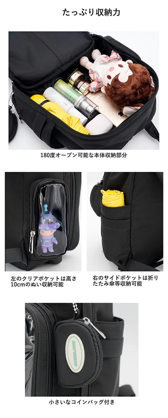 180度オープン可能な本体収納部分、左のクリアポケット、右のサイドポケット、それに小さいなコインバッグも付いています。多収納で整理しやすいです。
