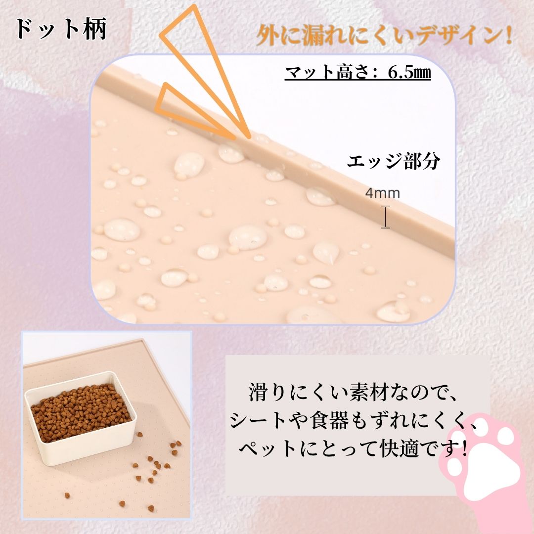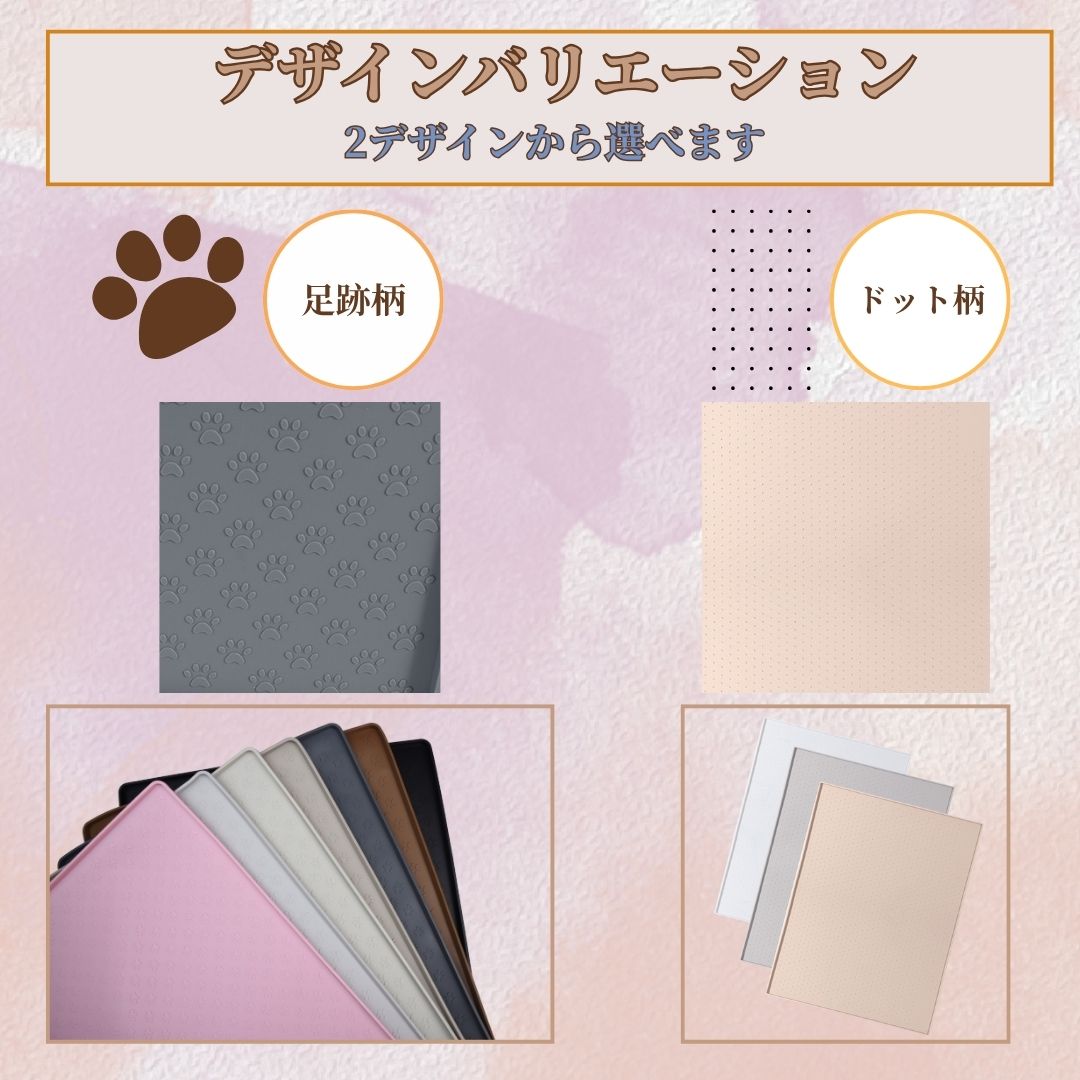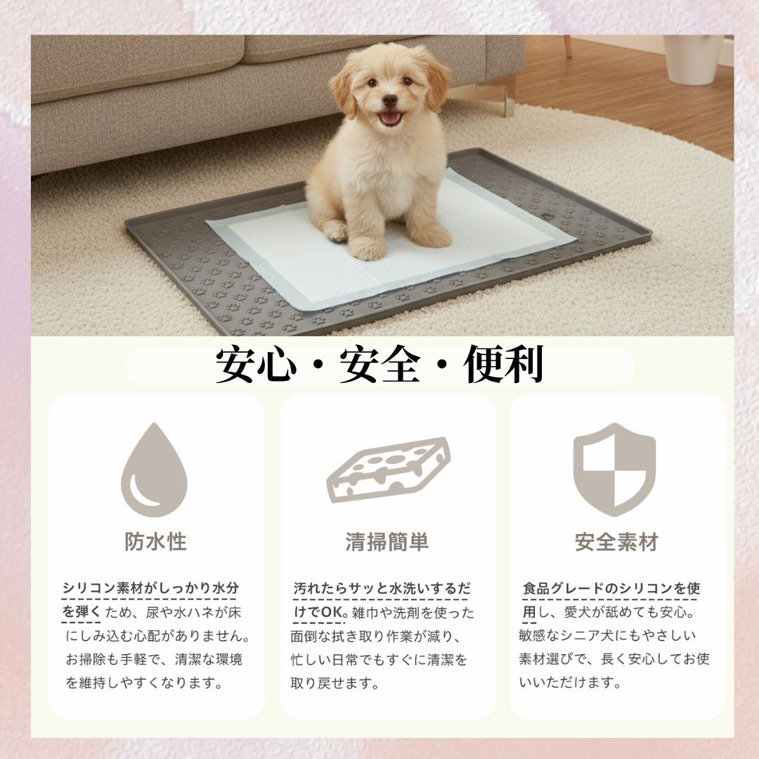 滑りにくく、ペットの足元をしっかり支える設計。尿や水がこぼれても防水・防汚仕様でお手入れが簡単です。