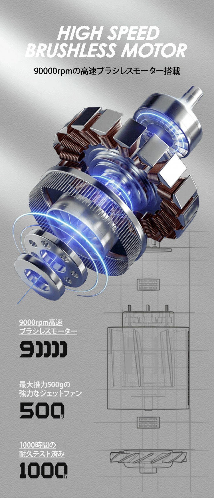 ※90000rpmのパワフルさ+45m/s超高速の強力ファン