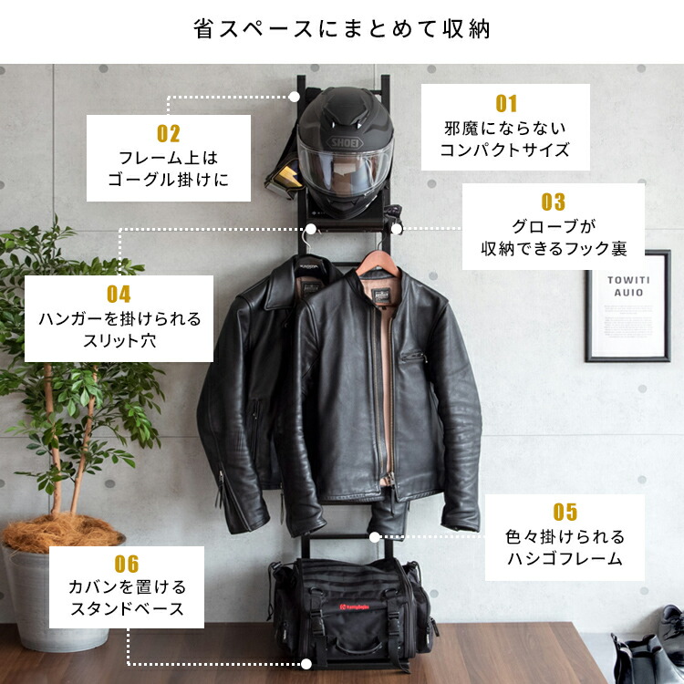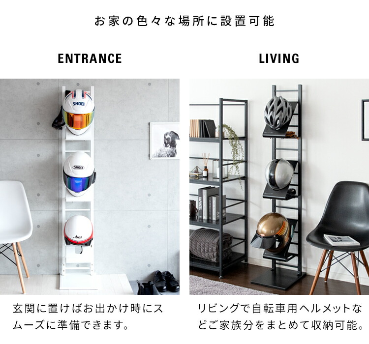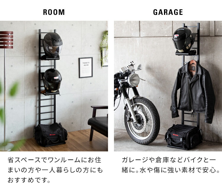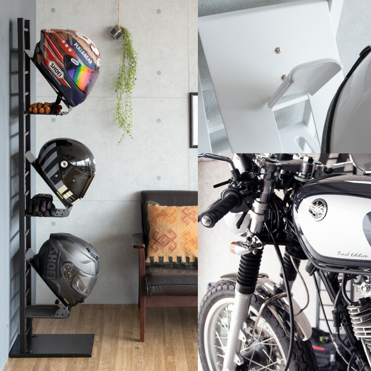 お気に入りのヘルメットを魅せながら省スペースに収納できるヘルメットスタンド。スタンドはグローブなどを置ける収納棚やジャケットを掛けられる仕様でお出かけ時に必要なものをまとめて収納できます。オプションのヘルメットフックを使用すれば最大3個まで収納が可能です。ホワイトとブラックの2カラーをご用意。お好みやお部屋の雰囲気でお選びください。バイカーはもちろん、努力義務となった自転車のヘルメット収納にも最適。ご家族でお使い頂けるアイテムです。